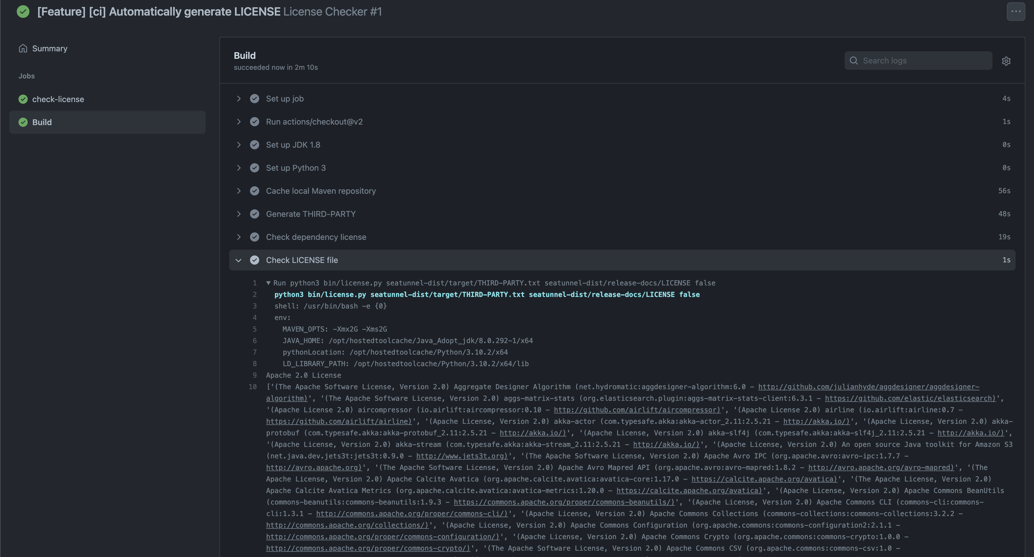 It looks like the license script runs fine in Github Action. FYI, https://github.com/apache/incubator-seatunnel/runs/5336363578?check_suite_focus=true  -- This is an automated message from the Apache Git Service. To respond to the message, please log on to GitHub and use the URL above to go to the specific comment. To unsubscribe, e-mail: [email protected] For queries about this service, please contact Infrastructure at: [email protected]