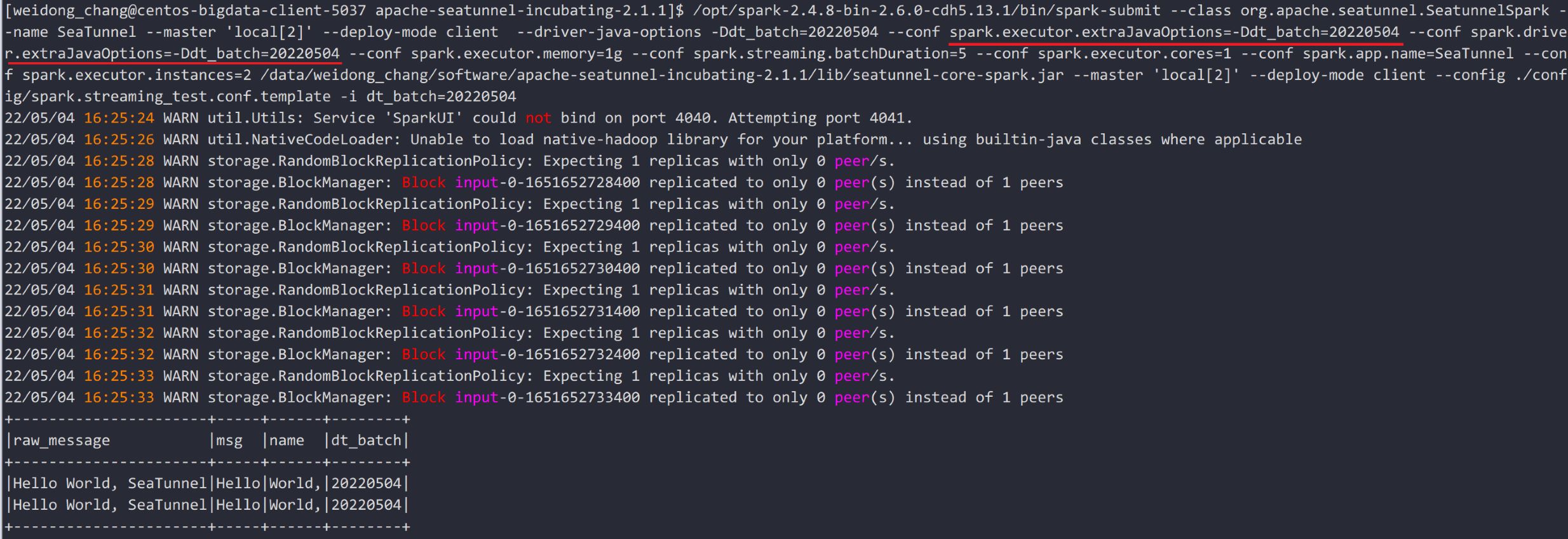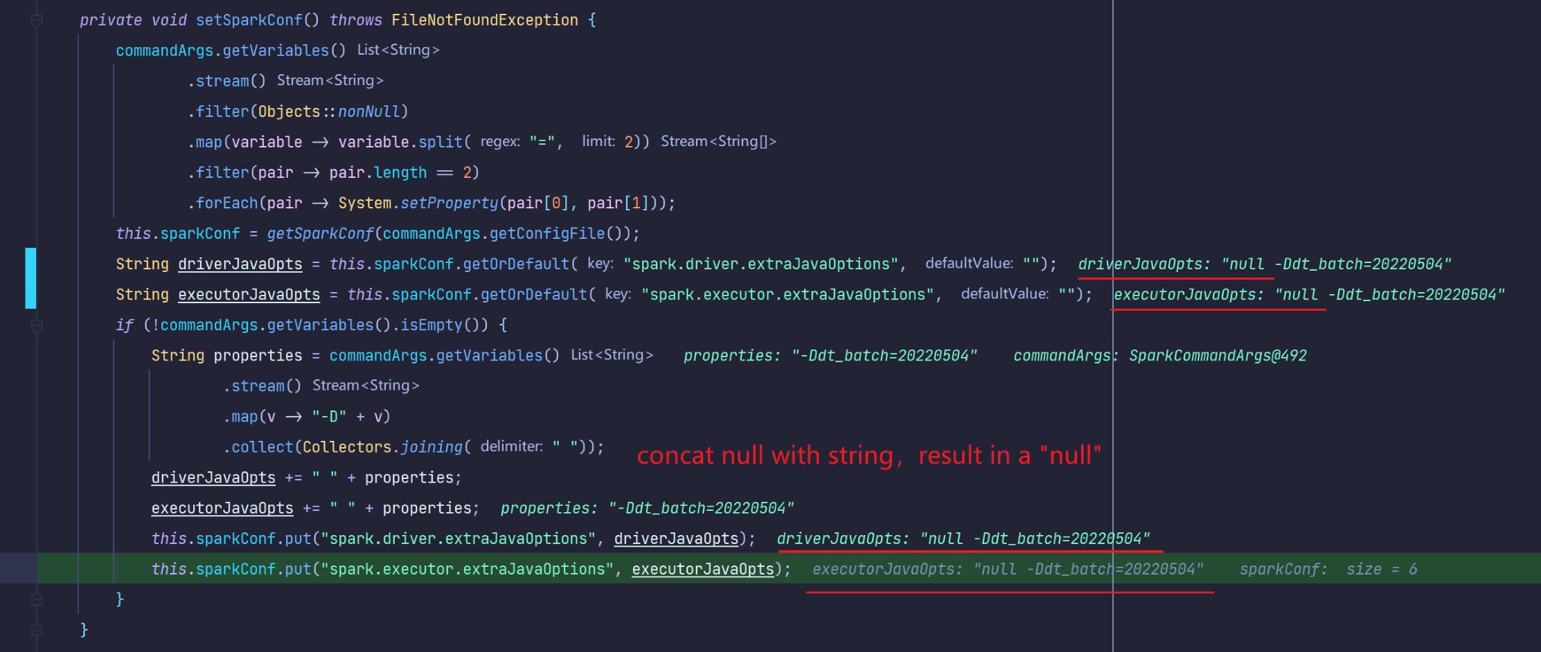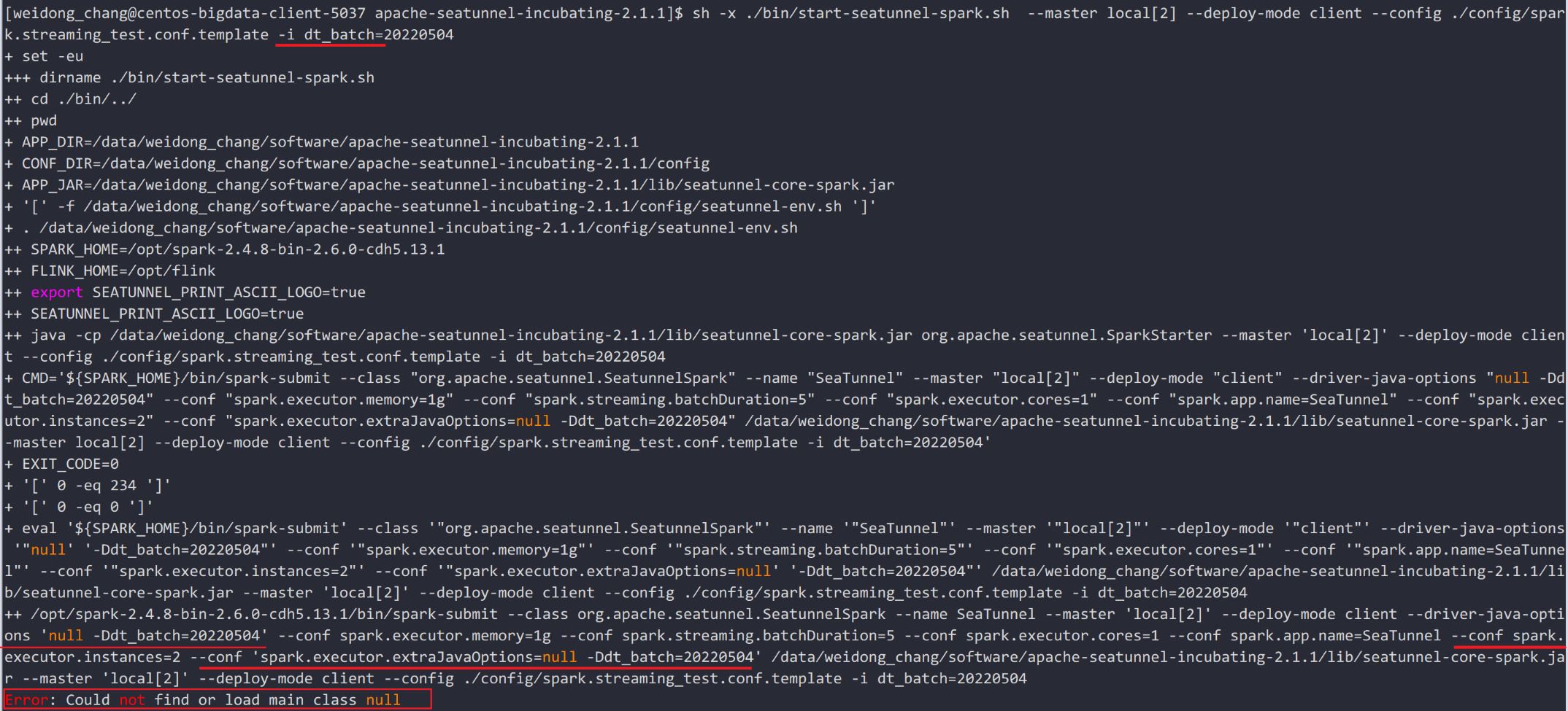 ### Search before asking - [X] I had searched in the [issues](https://github.com/apache/incubator-seatunnel/issues?q=is%3Aissue+label%3A%22bug%22) and found no similar issues. ### What happened When submitting a task using spark, if spark.executor.extraJavaOptions or spark.driver.extraJavaOptions is null, an exception parameter will be generated, resulting in submission failure. ### SeaTunnel Version v2.1.1 ### SeaTunnel Config ```conf env { # You can set spark configuration here # see available properties defined by spark: https://spark.apache.org/docs/latest/configuration.html#available-properties spark.app.name = "SeaTunnel" spark.executor.instances = 2 spark.executor.cores = 1 spark.executor.memory = "1g" spark.streaming.batchDuration = 5 } source { # This is a example input plugin **only for test and demonstrate the feature input plugin** fakeStream { content = ["Hello World, SeaTunnel"] } } transform { split { fields = ["msg", "name"] delimiter = "," } Sql { sql = "select *, '"${dt_batch}"' as dt_batch from split_result_table" } } sink { # choose stdout output plugin to output data to console Console {} } ``` ### Running Command ```shell ./bin/start-seatunnel-spark.sh --master local[2] --deploy-mode client --config ./config/spark.streaming_test_variable.conf -i dt_batch=20220504 ``` ### Error Exception ```log Error: Could not find or load main class null ``` ### Flink or Spark Version spark_version:2.4.8 ### Java or Scala Version java version "1.8.0_251" ### Screenshots **The bug situation replay**  **Debug**  **Right submit args**  ### Are you willing to submit PR? - [X] Yes I am willing to submit a PR! ### Code of Conduct - [X] I agree to follow this project's [Code of Conduct](https://www.apache.org/foundation/policies/conduct) -- This is an automated message from the Apache Git Service. To respond to the message, please log on to GitHub and use the URL above to go to the specific comment. To unsubscribe, e-mail: [email protected] For queries about this service, please contact Infrastructure at: [email protected]