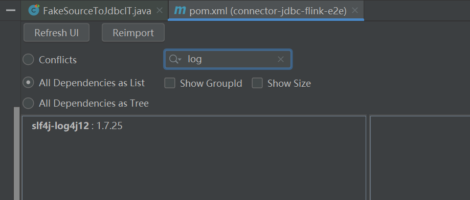 This is DEV branch.  I didn't find the `log4j`.and the error is `Failed to instantiate SLF4J LoggerFactory Reported exception: java.lang.NoClassDefFoundError: org/apache/log4j/Level at org.slf4j.LoggerFactory.bind(LoggerFactory.java:150) at org.slf4j.LoggerFactory.performInitialization(LoggerFactory.java:124) at org.slf4j.LoggerFactory.getILoggerFactory(LoggerFactory.java:412) at org.slf4j.LoggerFactory.getLogger(LoggerFactory.java:357) at org.slf4j.LoggerFactory.getLogger(LoggerFactory.java:383) at org.apache.seatunnel.e2e.flink.FlinkContainer.<clinit>(FlinkContainer.java:48) at sun.reflect.NativeConstructorAccessorImpl.newInstance0(Native Method) at sun.reflect.NativeConstructorAccessorImpl.newInstance(NativeConstructorAccessorImpl.java:62) at sun.reflect.DelegatingConstructorAccessorImpl.newInstance(DelegatingConstructorAccessorImpl.java:45) at java.lang.reflect.Constructor.newInstance(Constructor.java:423) at org.junit.platform.commons.util.ReflectionUtils.newInstance(ReflectionUtils.java:552) at org.junit.jupiter.engine.execution.ConstructorInvocation.proceed(ConstructorInvocation.java:56) at org.junit.jupiter.engine.execution.InvocationInterceptorChain$ValidatingInvocation.proceed(InvocationInterceptorChain.java:131) at org.junit.jupiter.api.extension.InvocationInterceptor.interceptTestClassConstructor(InvocationInterceptor.java:73) at org.junit.jupiter.engine.execution.InterceptingExecutableInvoker.lambda$invoke$0(InterceptingExecutableInvoker.java:93) at org.junit.jupiter.engine.execution.InvocationInterceptorChain$InterceptedInvocation.proceed(InvocationInterceptorChain.java:106) at org.junit.jupiter.engine.execution.InvocationInterceptorChain.proceed(InvocationInterceptorChain.java:64) at org.junit.jupiter.engine.execution.InvocationInterceptorChain.chainAndInvoke(InvocationInterceptorChain.java:45) at org.junit.jupiter.engine.execution.InvocationInterceptorChain.invoke(InvocationInterceptorChain.java:37) at org.junit.jupiter.engine.execution.InterceptingExecutableInvoker.invoke(InterceptingExecutableInvoker.java:92) at org.junit.jupiter.engine.execution.InterceptingExecutableInvoker.invoke(InterceptingExecutableInvoker.java:62) at org.junit.jupiter.engine.descriptor.ClassBasedTestDescriptor.invokeTestClassConstructor(ClassBasedTestDescriptor.java:363) at org.junit.jupiter.engine.descriptor.ClassBasedTestDescriptor.instantiateTestClass(ClassBasedTestDescriptor.java:310) at org.junit.jupiter.engine.descriptor.ClassTestDescriptor.instantiateTestClass(ClassTestDescriptor.java:79) at org.junit.jupiter.engine.descriptor.ClassBasedTestDescriptor.instantiateAndPostProcessTestInstance(ClassBasedTestDescriptor.java:286) at org.junit.jupiter.engine.descriptor.ClassBasedTestDescriptor.lambda$testInstancesProvider$4(ClassBasedTestDescriptor.java:278) at java.util.Optional.orElseGet(Optional.java:267) at org.junit.jupiter.engine.descriptor.ClassBasedTestDescriptor.lambda$testInstancesProvider$5(ClassBasedTestDescriptor.java:277) at org.junit.jupiter.engine.execution.TestInstancesProvider.getTestInstances(TestInstancesProvider.java:31) at org.junit.jupiter.engine.descriptor.TestMethodTestDescriptor.lambda$prepare$0(TestMethodTestDescriptor.java:105) at org.junit.platform.engine.support.hierarchical.ThrowableCollector.execute(ThrowableCollector.java:73) at org.junit.jupiter.engine.descriptor.TestMethodTestDescriptor.prepare(TestMethodTestDescriptor.java:104) at org.junit.jupiter.engine.descriptor.TestMethodTestDescriptor.prepare(TestMethodTestDescriptor.java:68) at org.junit.platform.engine.support.hierarchical.NodeTestTask.lambda$prepare$2(NodeTestTask.java:123) at org.junit.platform.engine.support.hierarchical.ThrowableCollector.execute(ThrowableCollector.java:73) at org.junit.platform.engine.support.hierarchical.NodeTestTask.prepare(NodeTestTask.java:123) at org.junit.platform.engine.support.hierarchical.NodeTestTask.execute(NodeTestTask.java:90) at java.util.ArrayList.forEach(ArrayList.java:1259) at org.junit.platform.engine.support.hierarchical.SameThreadHierarchicalTestExecutorService.invokeAll(SameThreadHierarchicalTestExecutorService.java:41) at org.junit.platform.engine.support.hierarchical.NodeTestTask.lambda$executeRecursively$6(NodeTestTask.java:155) at org.junit.platform.engine.support.hierarchical.ThrowableCollector.execute(ThrowableCollector.java:73) at org.junit.platform.engine.support.hierarchical.NodeTestTask.lambda$executeRecursively$8(NodeTestTask.java:141) at org.junit.platform.engine.support.hierarchical.Node.around(Node.java:137) at org.junit.platform.engine.support.hierarchical.NodeTestTask.lambda$executeRecursively$9(NodeTestTask.java:139) at org.junit.platform.engine.support.hierarchical.ThrowableCollector.execute(ThrowableCollector.java:73) at org.junit.platform.engine.support.hierarchical.NodeTestTask.executeRecursively(NodeTestTask.java:138) at org.junit.platform.engine.support.hierarchical.NodeTestTask.execute(NodeTestTask.java:95) at java.util.ArrayList.forEach(ArrayList.java:1259) at org.junit.platform.engine.support.hierarchical.SameThreadHierarchicalTestExecutorService.invokeAll(SameThreadHierarchicalTestExecutorService.java:41) at org.junit.platform.engine.support.hierarchical.NodeTestTask.lambda$executeRecursively$6(NodeTestTask.java:155) at org.junit.platform.engine.support.hierarchical.ThrowableCollector.execute(ThrowableCollector.java:73) at org.junit.platform.engine.support.hierarchical.NodeTestTask.lambda$executeRecursively$8(NodeTestTask.java:141) at org.junit.platform.engine.support.hierarchical.Node.around(Node.java:137) at org.junit.platform.engine.support.hierarchical.NodeTestTask.lambda$executeRecursively$9(NodeTestTask.java:139) at org.junit.platform.engine.support.hierarchical.ThrowableCollector.execute(ThrowableCollector.java:73) at org.junit.platform.engine.support.hierarchical.NodeTestTask.executeRecursively(NodeTestTask.java:138) at org.junit.platform.engine.support.hierarchical.NodeTestTask.execute(NodeTestTask.java:95) at org.junit.platfo