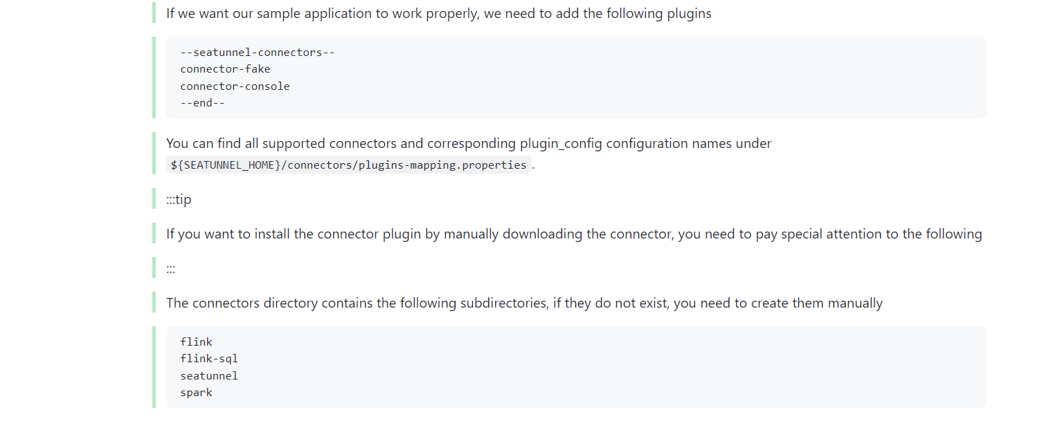 ########## versioned_docs/version-2.3.0-beta/start-v2/local.mdx: ########## @@ -0,0 +1,203 @@ +--- +sidebar_position: 2 +--- + +import Tabs from '@theme/Tabs'; +import TabItem from '@theme/TabItem'; + +# Set Up with Locally + +> Let's take an application that randomly generates data in memory, processes it through SQL, and finally outputs it to the console as an example. + +## Step 1: Prepare the environment + +Before you getting start the local run, you need to make sure you already have installed the following software which SeaTunnel required: + +* [Java](https://www.java.com/en/download/) (Java 8 or 11, other versions greater than Java 8 can theoretically work as well) installed and `JAVA_HOME` set. +* Download the engine, you can choose and download one of them from below as your favour, you could see more information about [why we need engine in SeaTunnel](../faq.md#why-i-should-install-computing-engine-like-spark-or-flink) +* Spark: Please [download Spark](https://spark.apache.org/downloads.html) first(**required version >= 2 and version < 3.x **). For more information you could +see [Getting Started: standalone](https://spark.apache.org/docs/latest/spark-standalone.html#installing-spark-standalone-to-a-cluster) +* Flink: Please [download Flink](https://flink.apache.org/downloads.html) first(**required version >= 1.12.0 and version < 1.14.x **). For more information you could see [Getting Started: standalone](https://nightlies.apache.org/flink/flink-docs-release-1.14/docs/deployment/resource-providers/standalone/overview/) + +## Step 2: Download SeaTunnel + +Enter the [seatunnel download page](https://seatunnel.apache.org/download) and download the latest version of distribute +package `seatunnel-<version>-bin.tar.gz` + +Or you can download it by terminal + +```shell +export version="2.3.0-beta" +wget "https://archive.apache.org/dist/incubator/seatunnel/${version}/apache-seatunnel-incubating-${version}-bin.tar.gz" +tar -xzvf "apache-seatunnel-incubating-${version}-bin.tar.gz" +``` +<!-- TODO: We should add example module as quick start which is no need for install Spark or Flink --> + +## Step 3: Install connectors plugin +Since 2.3.0-beta, the binary package does not provide connector dependencies by default, so when using it for the first time, we need to execute the following command to install the connector: (Of course, you can also manually download the connector from [Apache Maven Repository](https://repo. maven.apache.org/maven2/org/apache/seatunnel/ to download, then manually move to the seatunnel subdirectory under the connectors directory). +```bash +sh bin/install_plugin.sh 2.3.0-beta +``` +If you need to specify the version of the connector, take 2.3.0-beta as an example, we need to execute +```bash +sh bin/install_plugin.sh 2.3.0-beta +``` +Usually we don't need all the connector plugins, so you can specify the plugins you need by configuring `config/plugin_config`, for example, you only need the `connector-console` plugin, then you can modify plugin.properties as +```plugin_config +--seatunnel-connectors-- +connector-console +--end-- +``` +If we want our sample application to work properly, we need to add the following plugins + +```plugin_config +--seatunnel-connectors-- +connector-fake +connector-console +--end-- +``` + +You can find all supported connectors and corresponding plugin_config configuration names under `${SEATUNNEL_HOME}/connectors/plugins-mapping.properties`. + +:::tip Review Comment:  We can use this to open the `.mdx` file:  -- This is an automated message from the Apache Git Service. To respond to the message, please log on to GitHub and use the URL above to go to the specific comment. To unsubscribe, e-mail: [email protected] For queries about this service, please contact Infrastructure at: [email protected]