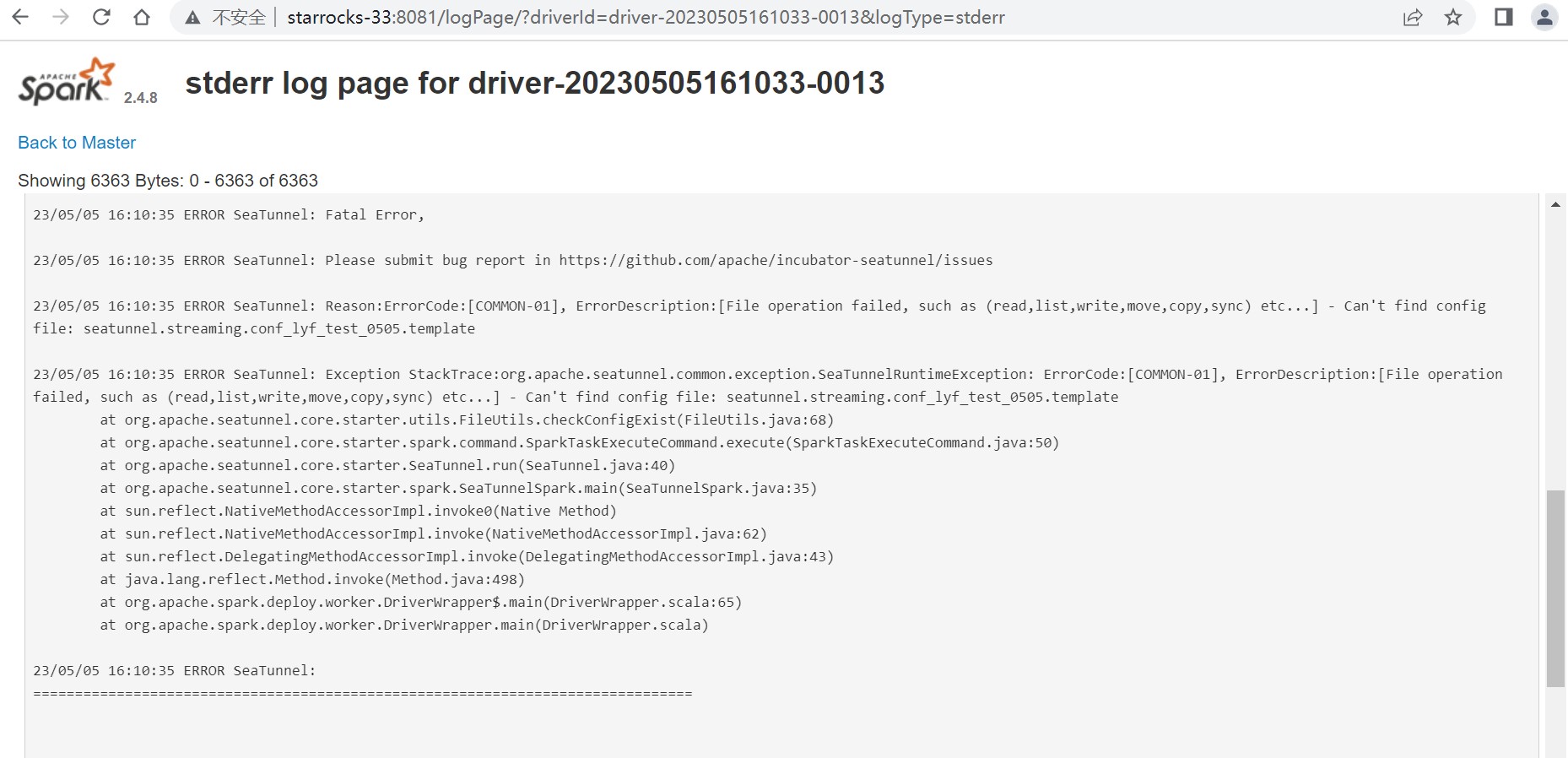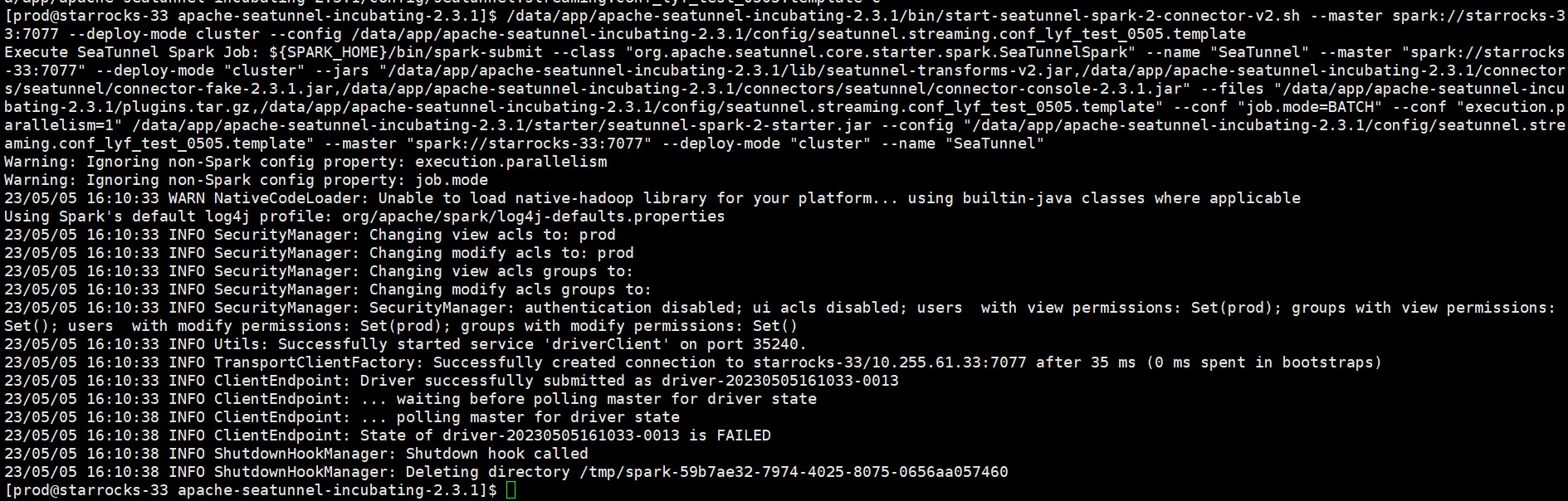 ### Search before asking - [X] I had searched in the [issues](https://github.com/apache/incubator-seatunnel/issues?q=is%3Aissue+label%3A%22bug%22) and found no similar issues. ### What happened when spark standalone cluster submit seatunnel job,Can't find config file。 一:config.file: env { execution.parallelism = 1 job.mode = "BATCH" } source { FakeSource { result_table_name = "fake" row.num = 16 schema = { fields { name = "string" age = "int" } } } } sink { Console {} } 二. command /data/app/apache-seatunnel-incubating-2.3.1/bin/start-seatunnel-spark-2-connector-v2.sh --master spark://starrocks-33:7077 --deploy-mode cluster --config /data/app/apache-seatunnel-incubating-2.3.1/config/seatunnel.streaming.conf_lyf_test_0505.template 三.Following error occurred: 23/05/05 16:10:35 ERROR SeaTunnel: =============================================================================== 23/05/05 16:10:35 ERROR SeaTunnel: Fatal Error, 23/05/05 16:10:35 ERROR SeaTunnel: Please submit bug report in https://github.com/apache/incubator-seatunnel/issues 23/05/05 16:10:35 ERROR SeaTunnel: Reason:ErrorCode:[COMMON-01], ErrorDescription:[File operation failed, such as (read,list,write,move,copy,sync) etc...] - Can't find config file: seatunnel.streaming.conf_lyf_test_0505.template 23/05/05 16:10:35 ERROR SeaTunnel: Exception StackTrace:org.apache.seatunnel.common.exception.SeaTunnelRuntimeException: ErrorCode:[COMMON-01], ErrorDescription:[File operation failed, such as (read,list,write,move,copy,sync) etc...] - Can't find config file: seatunnel.streaming.conf_lyf_test_0505.template at org.apache.seatunnel.core.starter.utils.FileUtils.checkConfigExist(FileUtils.java:68) at org.apache.seatunnel.core.starter.spark.command.SparkTaskExecuteCommand.execute(SparkTaskExecuteCommand.java:50) at org.apache.seatunnel.core.starter.SeaTunnel.run(SeaTunnel.java:40) at org.apache.seatunnel.core.starter.spark.SeaTunnelSpark.main(SeaTunnelSpark.java:35) at sun.reflect.NativeMethodAccessorImpl.invoke0(Native Method) at sun.reflect.NativeMethodAccessorImpl.invoke(NativeMethodAccessorImpl.java:62) at sun.reflect.DelegatingMethodAccessorImpl.invoke(DelegatingMethodAccessorImpl.java:43) at java.lang.reflect.Method.invoke(Method.java:498) at org.apache.spark.deploy.worker.DriverWrapper$.main(DriverWrapper.scala:65) at org.apache.spark.deploy.worker.DriverWrapper.main(DriverWrapper.scala) 23/05/05 16:10:35 ERROR SeaTunnel: ### SeaTunnel Version 2.3.1 ### SeaTunnel Config ```conf env { execution.parallelism = 1 job.mode = "BATCH" } source { FakeSource { result_table_name = "fake" row.num = 16 schema = { fields { name = "string" age = "int" } } } } sink { Console {} } ``` ### Running Command ```shell /data/app/apache-seatunnel-incubating-2.3.1/bin/start-seatunnel-spark-2-connector-v2.sh --master spark://starrocks-33:7077 --deploy-mode cluster --config /data/app/apache-seatunnel-incubating-2.3.1/config/seatunnel.streaming.conf_lyf_test_0505.template ``` ### Error Exception ```log 23/05/05 16:10:35 ERROR SeaTunnel: =============================================================================== 23/05/05 16:10:35 ERROR SeaTunnel: Fatal Error, 23/05/05 16:10:35 ERROR SeaTunnel: Please submit bug report in https://github.com/apache/incubator-seatunnel/issues 23/05/05 16:10:35 ERROR SeaTunnel: Reason:ErrorCode:[COMMON-01], ErrorDescription:[File operation failed, such as (read,list,write,move,copy,sync) etc...] - Can't find config file: seatunnel.streaming.conf_lyf_test_0505.template 23/05/05 16:10:35 ERROR SeaTunnel: Exception StackTrace:org.apache.seatunnel.common.exception.SeaTunnelRuntimeException: ErrorCode:[COMMON-01], ErrorDescription:[File operation failed, such as (read,list,write,move,copy,sync) etc...] - Can't find config file: seatunnel.streaming.conf_lyf_test_0505.template at org.apache.seatunnel.core.starter.utils.FileUtils.checkConfigExist(FileUtils.java:68) at org.apache.seatunnel.core.starter.spark.command.SparkTaskExecuteCommand.execute(SparkTaskExecuteCommand.java:50) at org.apache.seatunnel.core.starter.SeaTunnel.run(SeaTunnel.java:40) at org.apache.seatunnel.core.starter.spark.SeaTunnelSpark.main(SeaTunnelSpark.java:35) at sun.reflect.NativeMethodAccessorImpl.invoke0(Native Method) at sun.reflect.NativeMethodAccessorImpl.invoke(NativeMethodAccessorImpl.java:62) at sun.reflect.DelegatingMethodAccessorImpl.invoke(DelegatingMethodAccessorImpl.java:43) at java.lang.reflect.Method.invoke(Method.java:498) at org.apache.spark.deploy.worker.DriverWrapper$.main(DriverWrapper.scala:65) at org.apache.spark.deploy.worker.DriverWrapper.main(DriverWrapper.scala) 23/05/05 16:10:35 ERROR SeaTunnel: ``` ### Flink or Spark Version spark 2.4.8,standalone模式,且是单节点 ### Java or Scala Version java 1.8 ### Screenshots    ### Are you willing to submit PR? - [X] Yes I am willing to submit a PR! ### Code of Conduct - [X] I agree to follow this project's [Code of Conduct](https://www.apache.org/foundation/policies/conduct) -- This is an automated message from the Apache Git Service. To respond to the message, please log on to GitHub and use the URL above to go to the specific comment. To unsubscribe, e-mail: [email protected] For queries about this service, please contact Infrastructure at: [email protected]