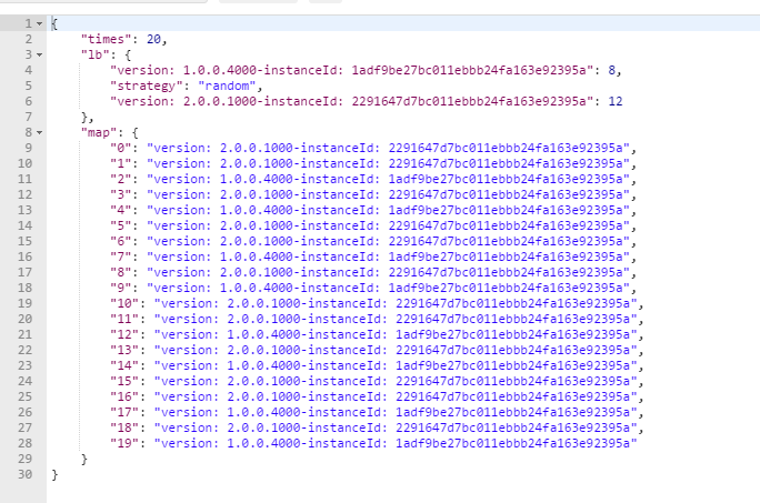 手动下发轮询策略配置或者不下发使用默认策略servicecomb.loadbalance.strategy.name,串行下发20个请求