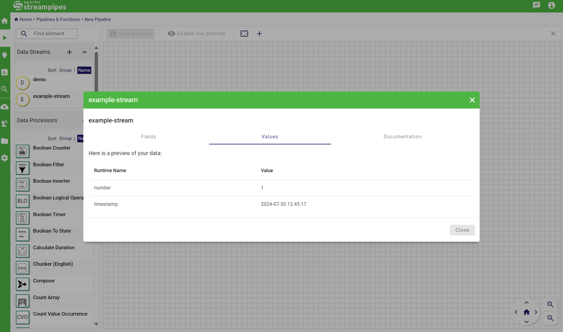 "If we now go into StreamPipes, create a new pipeline and view the info