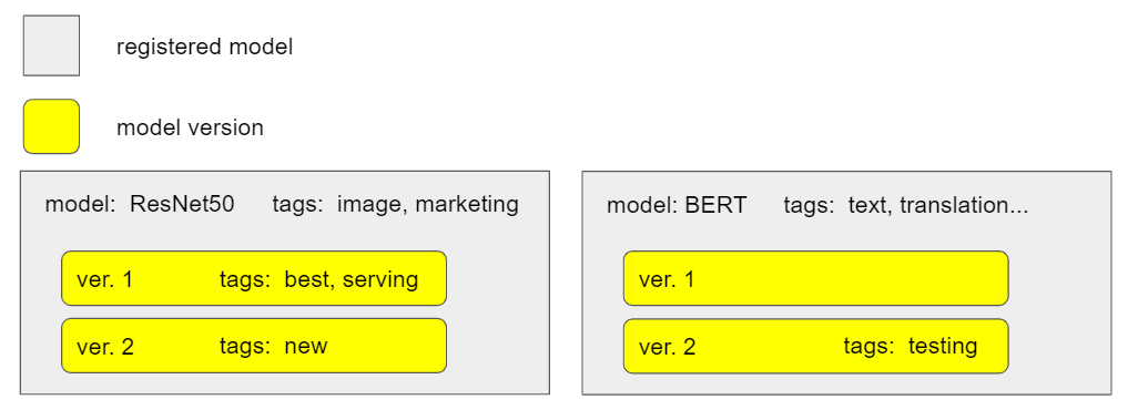 @pingsutw @jeff-901 I am so sorry for changing the table name in the database again. I think the previous names are the best. I will explain it as follow: workflow of model registry: 1. save models in s3 bucket (unregistered model) 2. choose the best model and registry it (registered model, version 1) 3. train the model with different parameters or datasets and save models in s3 bucket (unregistered model) 4. Again, choose the best model and registry it (registered model, version 2) Summary: * The table is storing registered models so the name `registered_model` is more proper. * The version of the registered model with the same name will define a different version which will be stored in another table. It is also proper to name the table `model_version` We also need two tag tables. example:  -- This is an automated message from the Apache Git Service. To respond to the message, please log on to GitHub and use the URL above to go to the specific comment. To unsubscribe, e-mail: [email protected] For queries about this service, please contact Infrastructure at: [email protected]