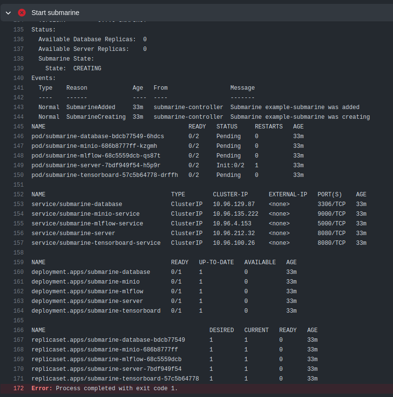 @pingsutw @Kenchu123 This PR can run successfully in my local machine after I set up a kind cluster and build the docker images and execute `start-submarine.sh` manually. However, in GitHub Actions all pods remain pending after a long period of time so the tests failed. I cannot find the reason. Can you help me?  -- This is an automated message from the Apache Git Service. To respond to the message, please log on to GitHub and use the URL above to go to the specific comment. To unsubscribe, e-mail: [email protected] For queries about this service, please contact Infrastructure at: [email protected]
