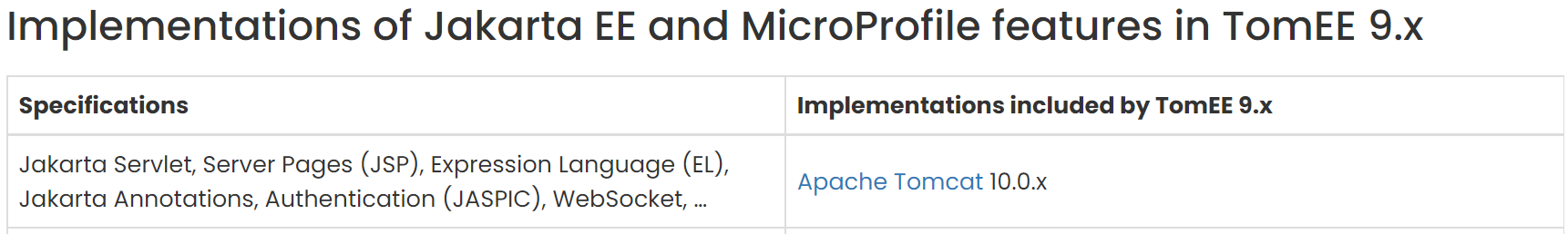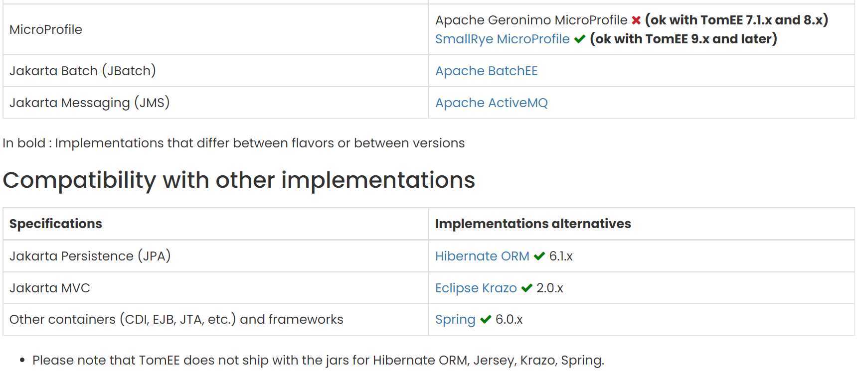 ASF GitHub Bot logged work on TOMEE-4023: ----------------------------------------- Author: ASF GitHub Bot Created on: 12/Sep/22 19:18 Start Date: 12/Sep/22 19:18 Worklog Time Spent: 10m Work Description: sultan commented on PR #914: URL: https://github.com/apache/tomee/pull/914#issuecomment-1244208611 Here is an extract of the current visual result :   Issue Time Tracking ------------------- Worklog Id: (was: 808015) Time Spent: 3.5h (was: 3h 20m) > Comparison pages with wrong specs per profiles > ---------------------------------------------- > > Key: TOMEE-4023 > URL: https://issues.apache.org/jira/browse/TOMEE-4023 > Project: TomEE > Issue Type: Documentation > Components: Website > Affects Versions: 7.0.9, 9.0.0-M8, 8.0.12 > Reporter: Gwénaël Ruelland > Assignee: Gwénaël Ruelland > Priority: Major > Attachments: image-2022-07-31-13-25-58-587.png > > Time Spent: 3.5h > Remaining Estimate: 0h > > Tomcat does not include JSTL nor the javax.security.enterprise.* packages. > These can be moved to WebProfile. > impacts main comparison page and per version pages (v9, v8, v7.1, v7.0) > !image-2022-07-31-13-25-58-587.png|width=562,height=378! -- This message was sent by Atlassian Jira (v8.20.10#820010)