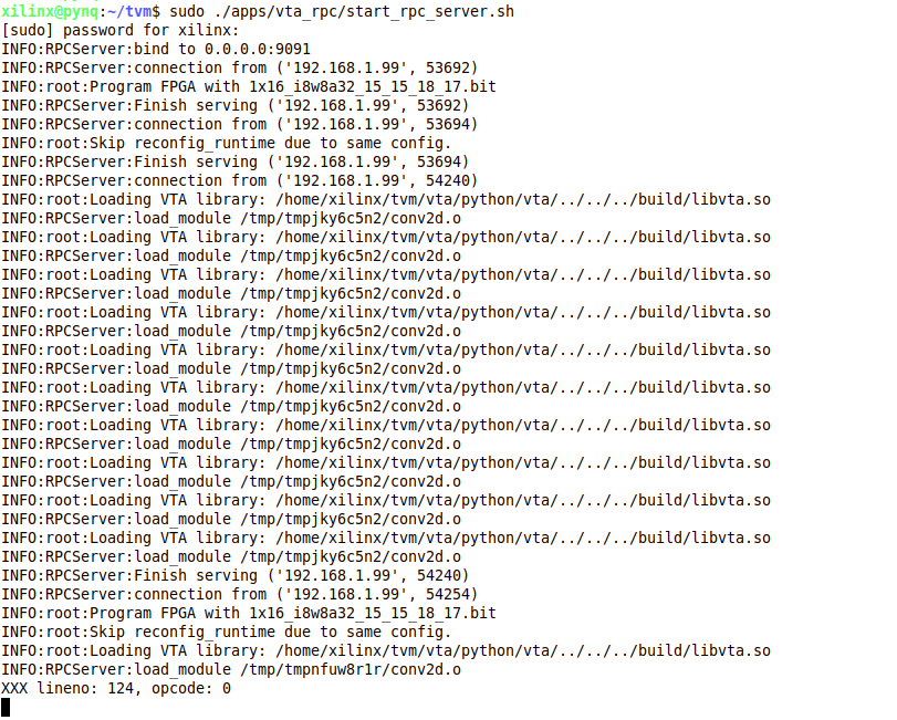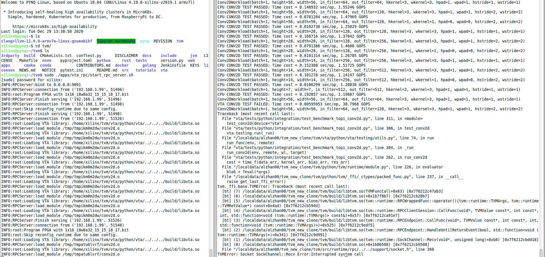 I am getting an error while following [Testing Pynq-based Hardware Setup](https://tvm.apache.org/docs/vta/install.html#testing-your-pynq-based-hardware-setup). First I used [Pynq 0.0.1 bitstream](https://github.com/uwsampl/vta-distro/tree/master/bitstreams/pynq/0.0.1), and ran the following on host/PC, while RPC server is running on the Pynq board: > python3 <tvm root>/vta/tests/python/integration/test_benchmark_topi_conv2d.py Which resulted in RecursionError. See @lhf1997 comment under: https://github.com/apache/tvm/pull/6012#issuecomment-656022147. See also: https://discuss.tvm.apache.org/t/vta-recursion-error/7271. Then I tried with [Pynq 0.0.2 bitstream](https://github.com/uwsampl/vta-distro/tree/master/bitstreams/pynq/0.0.2), and got the following output: VTA CONV2D TEST FAILED, as shown in the picture below (the one on the right is the host/PC output and the one on the left is the board output):  I tried to run again and got some other error, as shown in the picture below:  The error in both cases seems to be related to loading VTA library libvta.so and conv2d.o! Any idea? ---------------------------------------------------------------- This is an automated message from the Apache Git Service. To respond to the message, please log on to GitHub and use the URL above to go to the specific comment. For queries about this service, please contact Infrastructure at: [email protected]