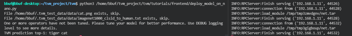 This PR shows an example of inferring a ResNet pre-trained model on Jetson Nano, hoping to be accepted. Both inference modes (local and rpc remote) can successfully complete the prediction. The following is the test record. remote rpc:  local_demo:  -- This is an automated message from the Apache Git Service. To respond to the message, please log on to GitHub and use the URL above to go to the specific comment. To unsubscribe, e-mail: [email protected] For queries about this service, please contact Infrastructure at: [email protected]