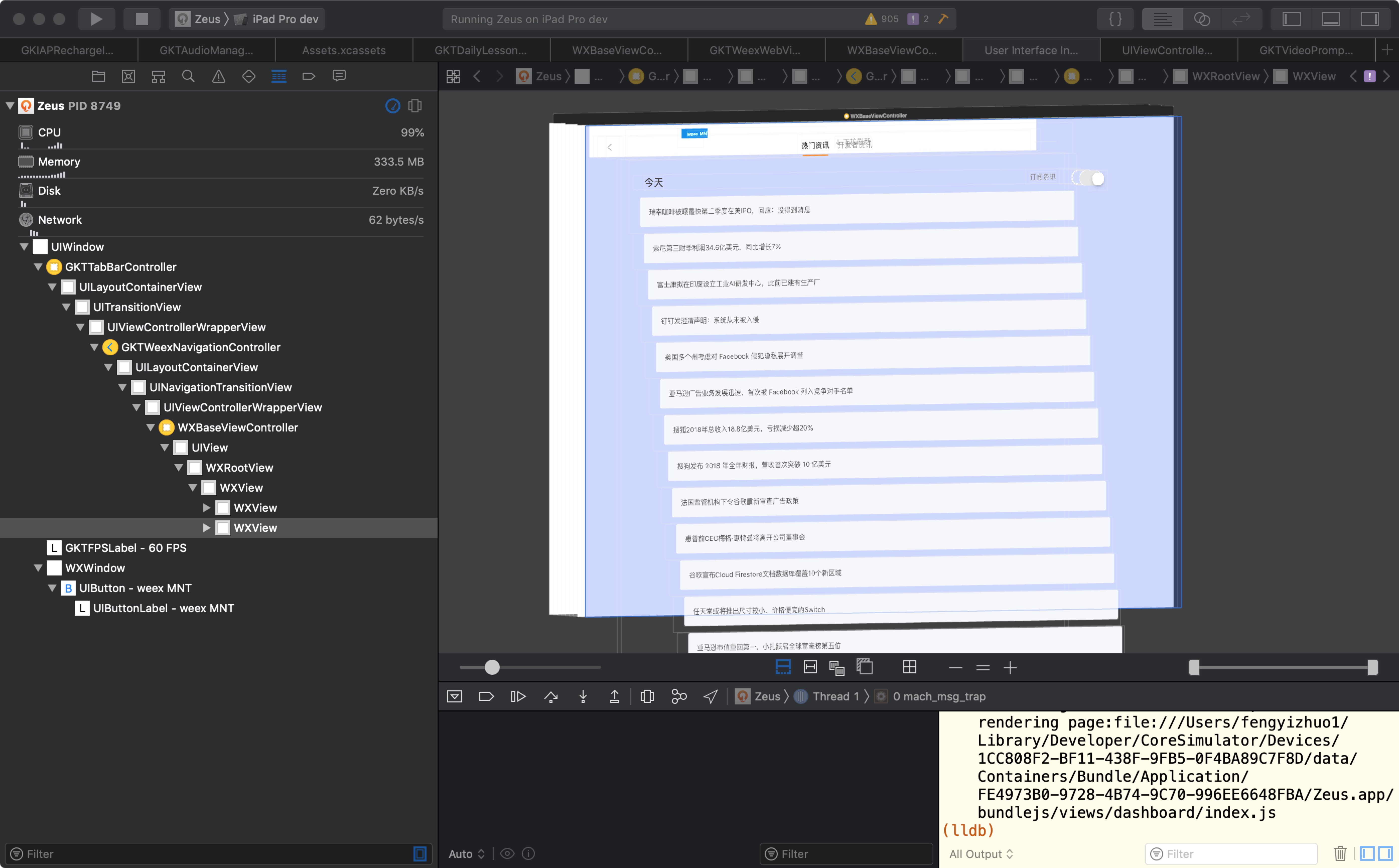 MappleHero commented on issue #2103: Screen orientation problem with iPad version of our app URL: https://github.com/apache/incubator-weex/issues/2103#issuecomment-459940605 The way we try to solve this problem is very complicated. In two steps In the first step, the Native side hooks the viewDidLoad method of the WXBaseViewController of the Weex page, adding a monitor for screen rotation. ``` [[NSNotificationCenter defaultCenter] addObserver:self selector:@selector(onDeviceOrientationChange) name:UIDeviceOrientationDidChangeNotification object:nil]; ``` ``` - (void)onDeviceOrientationChange { if (UIDeviceOrientationIsLandscape([UIDevice currentDevice].orientation)) { // 不起作用 // [self.view setNeedsLayout]; // [self.view layoutIfNeeded]; // [self.view.subviews[0] layoutIfNeeded]; // [self.view.subviews[0] setNeedsLayout]; self.view.subviews[0].frame = CGRectMake(self.view.subviews[0].frame.origin.x, self.view.subviews[0].frame.origin.y, GKT_SCREEN_WIDTH, GKT_SCREEN_HEIGHT); self.view.subviews[0].subviews[0].frame = CGRectMake(self.view.subviews[0].subviews[0].frame.origin.x, self.view.subviews[0].subviews[0].frame.origin.y, GKT_SCREEN_WIDTH, GKT_SCREEN_HEIGHT); } else { self.view.subviews[0].frame = CGRectMake(self.view.subviews[0].frame.origin.x, self.view.subviews[0].frame.origin.y, GKT_SCREEN_WIDTH, GKT_SCREEN_HEIGHT); self.view.subviews[0].subviews[0].frame = CGRectMake(self.view.subviews[0].subviews[0].frame.origin.x, self.view.subviews[0].subviews[0].frame.origin.y, GKT_SCREEN_WIDTH, GKT_SCREEN_HEIGHT); } } ```  Because Weex can't dynamically update the page frame,native side manual update the WXRootView and WXView frame. The second step is to listen to the notification on the Weex side and modify the page frame. But this method is not elegant, I hope there is a better way.