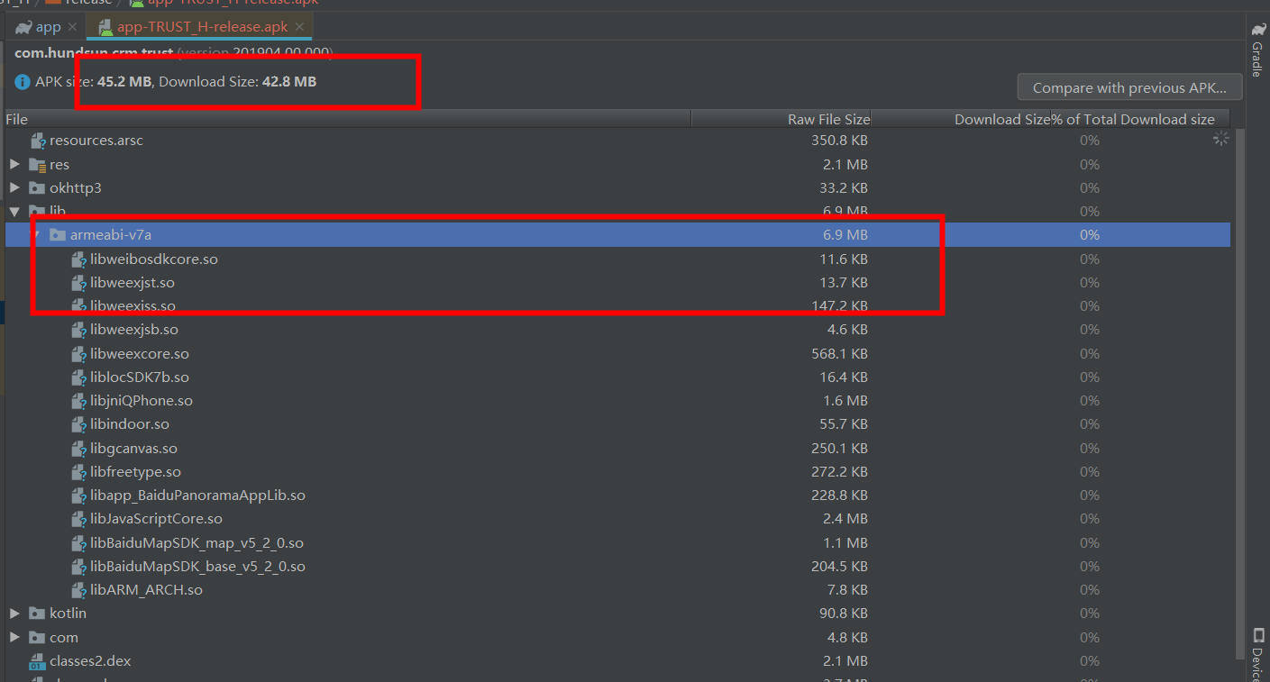 KaelInvoker opened a new issue #2852: 0.20版本windows打包和mac打包发现apk大小不一致!大佬们什么原因 URL: https://github.com/apache/incubator-weex/issues/2852   同样的打包配置,我本地是windows本。服务器是mac本,用gradle assembleRelease命令打包,发现服务器打的apk包里的so库大小比windows大很多。哪位大佬知道?最初我以为是AS3.0自动压缩so导致,当我本地配置了不压缩后,重新打包还是和之前的大小一样大。 packagingOptions{ doNotStrip "*/armeabi-v7a/*.so" } 另外,我发现自己本地打包时,下面的两个目录的so库大小也不一直。