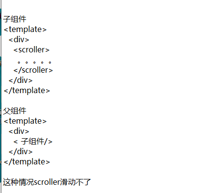 wangxiongtao commented on issue #3164: [Android]子组件中有scroller ,父组件引用时scroller滑动不了 URL: https://github.com/apache/incubator-weex/issues/3164#issuecomment-598074133  这种写法 就滑动不了