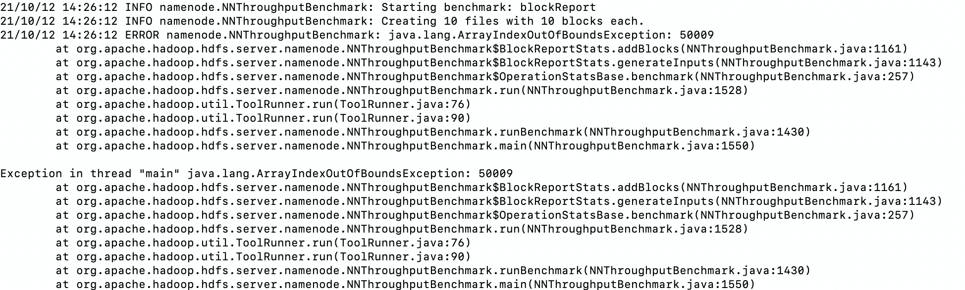 ### Description of PR When using NNThroughputBenchmark to test blockReport, some exceptions will be prompted. E.g:  The purpose of this issue is to solve this problem. ### How was this patch tested? When using the same command, the same exception will not occur. -- This is an automated message from the Apache Git Service. To respond to the message, please log on to GitHub and use the URL above to go to the specific comment. To unsubscribe, e-mail: [email protected] For queries about this service, please contact Infrastructure at: [email protected] --------------------------------------------------------------------- To unsubscribe, e-mail: [email protected] For additional commands, e-mail: [email protected]