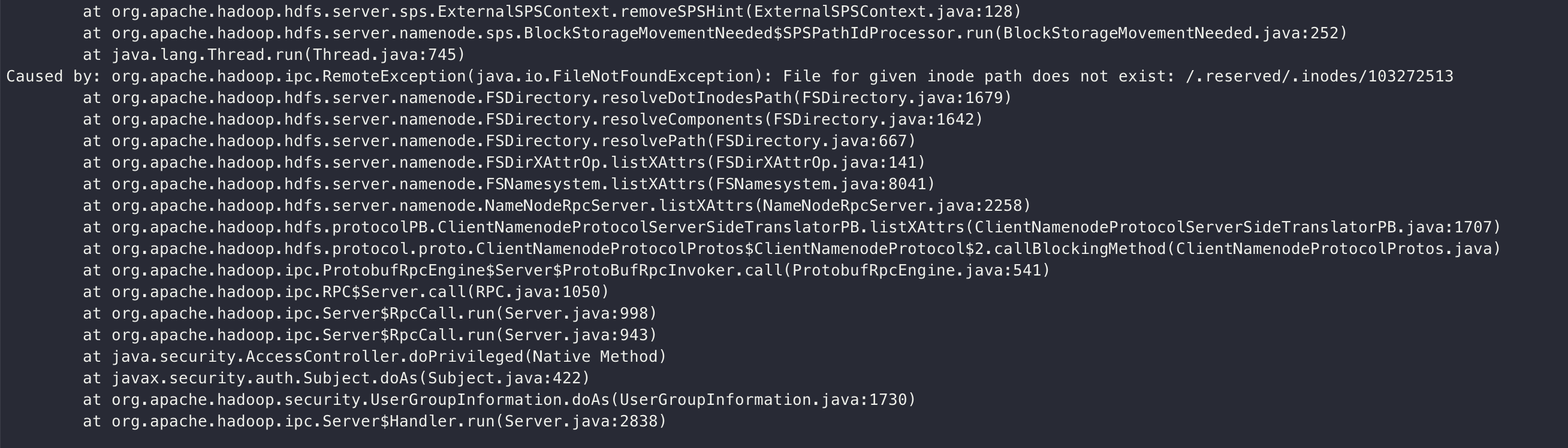 JIRA: [HDFS-16484](https://issues.apache.org/jira/browse/HDFS-16484) In SPSPathIdProcessor thread, if it get a inodeId which path does not exist, then the SPSPathIdProcessor thread entry infinite loop and can't work normally.  -- This is an automated message from the Apache Git Service. To respond to the message, please log on to GitHub and use the URL above to go to the specific comment. To unsubscribe, e-mail: [email protected] For queries about this service, please contact Infrastructure at: [email protected] --------------------------------------------------------------------- To unsubscribe, e-mail: [email protected] For additional commands, e-mail: [email protected]