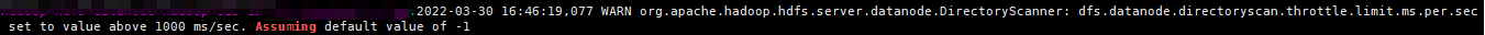 @cxorm @ayushtkn sorry for update later ,currently if no value was set for dfs.datanode.directoryscan.throttle.limit.ms.per.sec, the following message will always appear , we can still respect the default value as 1000, means no rate limit. and we also need to keep the same value for DFS_DATANODE_DIRECTORYSCAN_THROTTLE_LIMIT_MS_PER_SEC_DEFAULT and value in hdfs-default.xml  -- This is an automated message from the Apache Git Service. To respond to the message, please log on to GitHub and use the URL above to go to the specific comment. To unsubscribe, e-mail: [email protected] For queries about this service, please contact Infrastructure at: [email protected] --------------------------------------------------------------------- To unsubscribe, e-mail: [email protected] For additional commands, e-mail: [email protected]