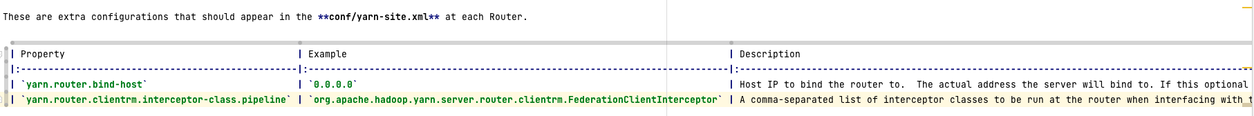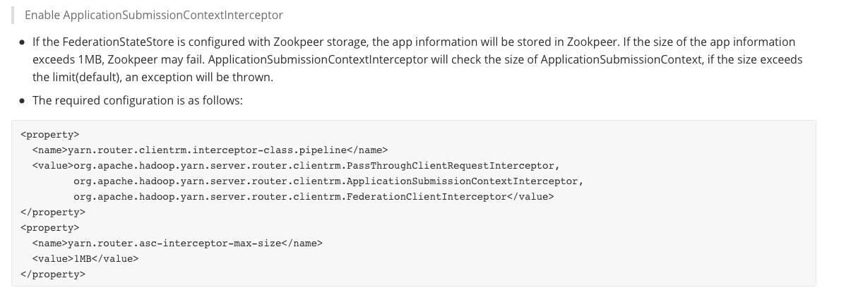########## hadoop-yarn-project/hadoop-yarn/hadoop-yarn-server/hadoop-yarn-server-router/src/test/java/org/apache/hadoop/yarn/server/router/clientrm/TestApplicationSubmissionContextInterceptor.java: ########## @@ -0,0 +1,160 @@ +/** + * Licensed to the Apache Software Foundation (ASF) under one + * or more contributor license agreements. See the NOTICE file + * distributed with this work for additional information + * regarding copyright ownership. The ASF licenses this file + * to you under the Apache License, Version 2.0 (the + * "License"); you may not use this file except in compliance + * with the License. You may obtain a copy of the License at + * + * http://www.apache.org/licenses/LICENSE-2.0 + * + * Unless required by applicable law or agreed to in writing, software + * distributed under the License is distributed on an "AS IS" BASIS, + * WITHOUT WARRANTIES OR CONDITIONS OF ANY KIND, either express or implied. + * See the License for the specific language governing permissions and + * limitations under the License. + */ + +package org.apache.hadoop.yarn.server.router.clientrm; + +import java.nio.ByteBuffer; +import java.util.ArrayList; +import java.util.HashMap; +import java.util.List; +import java.util.Map; + +import org.apache.hadoop.conf.Configuration; +import org.apache.hadoop.test.LambdaTestUtils; +import org.apache.hadoop.yarn.api.protocolrecords.SubmitApplicationRequest; +import org.apache.hadoop.yarn.api.records.ApplicationAccessType; +import org.apache.hadoop.yarn.api.records.ApplicationId; +import org.apache.hadoop.yarn.api.records.ApplicationSubmissionContext; +import org.apache.hadoop.yarn.api.records.ContainerLaunchContext; +import org.apache.hadoop.yarn.api.records.LocalResource; +import org.apache.hadoop.yarn.api.records.LocalResourceType; +import org.apache.hadoop.yarn.api.records.LocalResourceVisibility; +import org.apache.hadoop.yarn.api.records.Priority; +import org.apache.hadoop.yarn.api.records.Resource; +import org.apache.hadoop.yarn.api.records.URL; +import org.apache.hadoop.yarn.api.records.impl.pb.ApplicationSubmissionContextPBImpl; +import org.apache.hadoop.yarn.conf.YarnConfiguration; +import org.apache.hadoop.yarn.exceptions.YarnException; +import org.apache.hadoop.yarn.server.router.RouterServerUtil; +import org.junit.Test; + +/** + * Extends the {@code BaseRouterClientRMTest} and overrides methods in order to + * use the {@code RouterClientRMService} pipeline test cases for testing the + * {@code ApplicationSubmissionContextInterceptor} class. The tests for + * {@code RouterClientRMService} has been written cleverly so that it can be + * reused to validate different request interceptor chains. + */ +public class TestApplicationSubmissionContextInterceptor extends BaseRouterClientRMTest { + + @Override + protected YarnConfiguration createConfiguration() { + YarnConfiguration conf = new YarnConfiguration(); + String mockPassThroughInterceptorClass = + PassThroughClientRequestInterceptor.class.getName(); + + // Create a request interceptor pipeline for testing. The last one in the + // chain is the application submission context interceptor that checks + // for exceeded submission context size + // The others in the chain will simply forward it to the next one in the + // chain + conf.set(YarnConfiguration.ROUTER_CLIENTRM_INTERCEPTOR_CLASS_PIPELINE, Review Comment: When adding documentation, I found an issue: the markdown table is not readable, I will align the table. > before improvement  > after improvement   -- This is an automated message from the Apache Git Service. To respond to the message, please log on to GitHub and use the URL above to go to the specific comment. To unsubscribe, e-mail: [email protected] For queries about this service, please contact Infrastructure at: [email protected] --------------------------------------------------------------------- To unsubscribe, e-mail: [email protected] For additional commands, e-mail: [email protected]