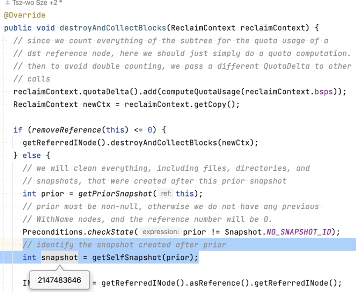 When I was debugging, here the call trace: cleanFile:128, FileWithSnapshotFeature (org.apache.hadoop.hdfs.server.namenode.snapshot) cleanSubtree:755, INodeFile (org.apache.hadoop.hdfs.server.namenode) destroyDstSubtree:409, DirectoryWithSnapshotFeature (org.apache.hadoop.hdfs.server.namenode.snapshot) destroyDstSubtree:405, DirectoryWithSnapshotFeature (org.apache.hadoop.hdfs.server.namenode.snapshot) destroyDstSubtree:405, DirectoryWithSnapshotFeature (org.apache.hadoop.hdfs.server.namenode.snapshot) destroyDstSubtree:435, DirectoryWithSnapshotFeature (org.apache.hadoop.hdfs.server.namenode.snapshot) destroyDstSubtree:435, DirectoryWithSnapshotFeature (org.apache.hadoop.hdfs.server.namenode.snapshot) destroyAndCollectBlocks:847, INodeReference$DstReference (org.apache.hadoop.hdfs.server.namenode) cleanDirectory:762, DirectoryWithSnapshotFeature (org.apache.hadoop.hdfs.server.namenode.snapshot) cleanSubtree:848, INodeDirectory (org.apache.hadoop.hdfs.server.namenode) cleanSubtree:314, INodeReference (org.apache.hadoop.hdfs.server.namenode) cleanSubtree:659, INodeReference$WithName (org.apache.hadoop.hdfs.server.namenode) cleanSubtreeRecursively:819, INodeDirectory (org.apache.hadoop.hdfs.server.namenode) cleanDirectory:734, DirectoryWithSnapshotFeature (org.apache.hadoop.hdfs.server.namenode.snapshot) cleanSubtree:848, INodeDirectory (org.apache.hadoop.hdfs.server.namenode) cleanSubtreeRecursively:819, INodeDirectory (org.apache.hadoop.hdfs.server.namenode) cleanDirectory:734, DirectoryWithSnapshotFeature (org.apache.hadoop.hdfs.server.namenode.snapshot) cleanSubtree:848, INodeDirectory (org.apache.hadoop.hdfs.server.namenode) cleanSubtreeRecursively:819, INodeDirectory (org.apache.hadoop.hdfs.server.namenode) cleanDirectory:734, DirectoryWithSnapshotFeature (org.apache.hadoop.hdfs.server.namenode.snapshot) cleanSubtree:848, INodeDirectory (org.apache.hadoop.hdfs.server.namenode) cleanSubtreeRecursively:819, INodeDirectory (org.apache.hadoop.hdfs.server.namenode) cleanSubtree:866, INodeDirectory (org.apache.hadoop.hdfs.server.namenode) cleanSubtreeRecursively:819, INodeDirectory (org.apache.hadoop.hdfs.server.namenode) cleanSubtree:866, INodeDirectory (org.apache.hadoop.hdfs.server.namenode) cleanSubtreeRecursively:819, INodeDirectory (org.apache.hadoop.hdfs.server.namenode) cleanSubtree:866, INodeDirectory (org.apache.hadoop.hdfs.server.namenode) cleanSubtreeRecursively:819, INodeDirectory (org.apache.hadoop.hdfs.server.namenode) cleanDirectory:734, DirectoryWithSnapshotFeature (org.apache.hadoop.hdfs.server.namenode.snapshot) cleanSubtree:848, INodeDirectory (org.apache.hadoop.hdfs.server.namenode) removeSnapshot:266, DirectorySnapshottableFeature (org.apache.hadoop.hdfs.server.namenode.snapshot) removeSnapshot:298, INodeDirectory (org.apache.hadoop.hdfs.server.namenode) deleteSnapshot:541, SnapshotManager (org.apache.hadoop.hdfs.server.namenode.snapshot) deleteSnapshot:280, FSDirSnapshotOp (org.apache.hadoop.hdfs.server.namenode) deleteSnapshot:264, FSDirSnapshotOp (org.apache.hadoop.hdfs.server.namenode) deleteSnapshot:7012, FSNamesystem (org.apache.hadoop.hdfs.server.namenode) testValidation1:80, TestFsImageValidation (org.apache.hadoop.hdfs.server.namenode) invoke0:-1, NativeMethodAccessorImpl (sun.reflect) invoke:62, NativeMethodAccessorImpl (sun.reflect) invoke:43, DelegatingMethodAccessorImpl (sun.reflect) invoke:498, Method (java.lang.reflect) runReflectiveCall:50, FrameworkMethod$1 (org.junit.runners.model) run:12, ReflectiveCallable (org.junit.internal.runners.model) invokeExplosively:47, FrameworkMethod (org.junit.runners.model) evaluate:17, InvokeMethod (org.junit.internal.runners.statements) runLeaf:325, ParentRunner (org.junit.runners) runChild:78, BlockJUnit4ClassRunner (org.junit.runners) runChild:57, BlockJUnit4ClassRunner (org.junit.runners) run:290, ParentRunner$3 (org.junit.runners) schedule:71, ParentRunner$1 (org.junit.runners) runChildren:288, ParentRunner (org.junit.runners) access$000:58, ParentRunner (org.junit.runners) evaluate:268, ParentRunner$2 (org.junit.runners) run:363, ParentRunner (org.junit.runners) run:137, JUnitCore (org.junit.runner) startRunnerWithArgs:69, JUnit4IdeaTestRunner (com.intellij.junit4) execute:38, IdeaTestRunner$Repeater$1 (com.intellij.rt.junit) repeat:11, TestsRepeater (com.intellij.rt.execution.junit) startRunnerWithArgs:35, IdeaTestRunner$Repeater (com.intellij.rt.junit) prepareStreamsAndStart:232, JUnitStarter (com.intellij.rt.junit) main:55, JUnitStarter (com.intellij.rt.junit) This is the place this patch is trying to fix the issue. My other question is, when call reaches here, the snapshot id is CURRENT_STATE_ID, which represent current state. Why are we proceeding to clean subtree originally with CURRENT_STATE_ID. Could you provide more details on that? Below image showing where we started using CURRENT_STATE_ID  -- This is an automated message from the Apache Git Service. To respond to the message, please log on to GitHub and use the URL above to go to the specific comment. To unsubscribe, e-mail: [email protected] For queries about this service, please contact Infrastructure at: [email protected] --------------------------------------------------------------------- To unsubscribe, e-mail: [email protected] For additional commands, e-mail: [email protected]