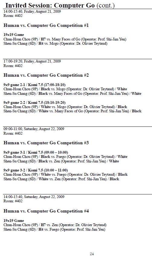 Forthcoming human-vs-computer games in go: http://www.althofer.de/ieee-go-0.jpg http://www.althofer.de/ieee-go-1.jpg http://www.althofer.de/ieee-go-2.jpg http://www.althofer.de/ieee-go-3.jpg
