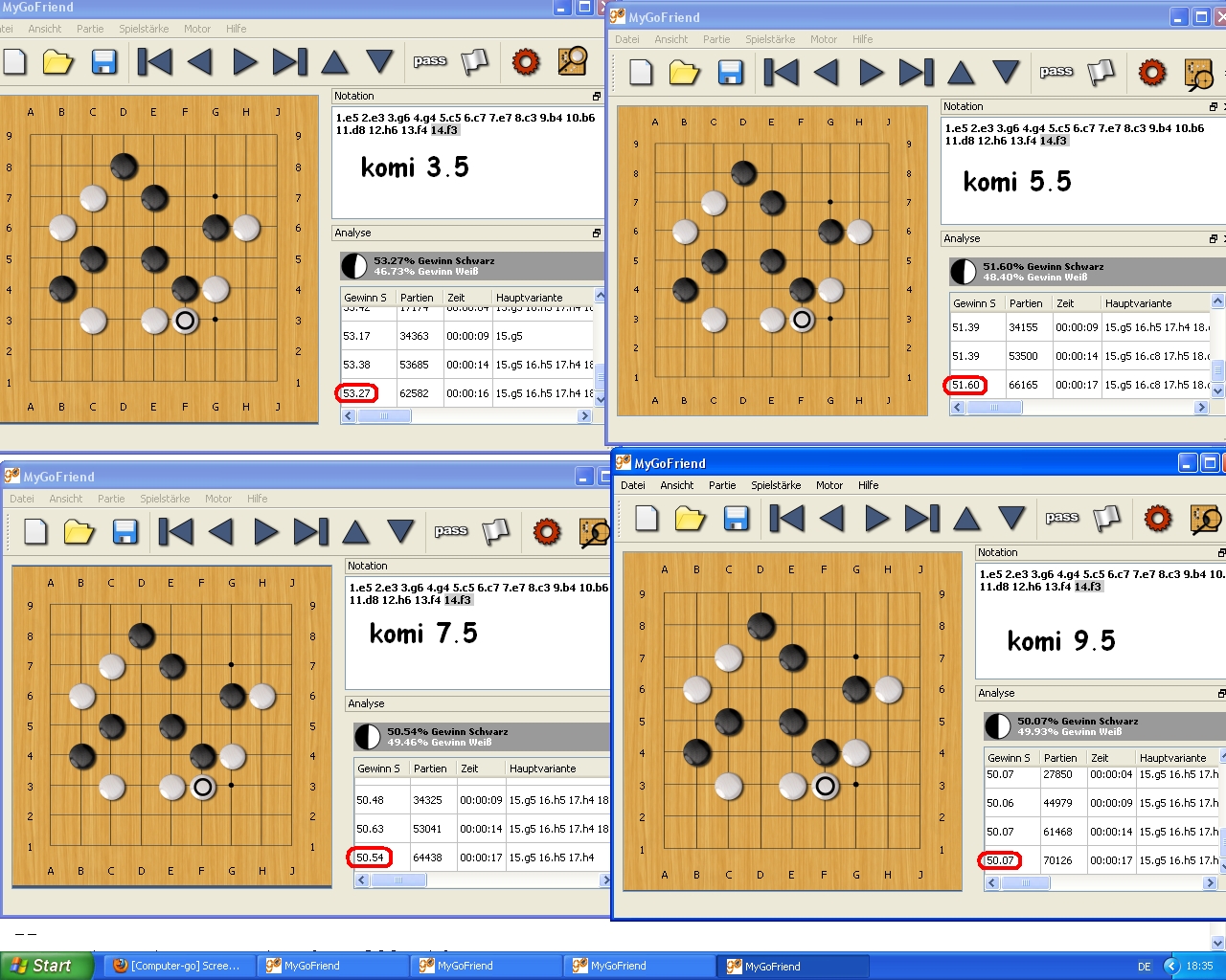 Hello, I just fiddled around a little bit with several windows of MyGoFriend, each one with a different komi value for the same position. Giving the bot about 18 seconds of thinking time in each case for komi values 3.5 5.5 7.5 9.5 gave the following scores (chances for Black, decreasing when komi goes up): http://www.althofer.de/komi-orgel.jpg