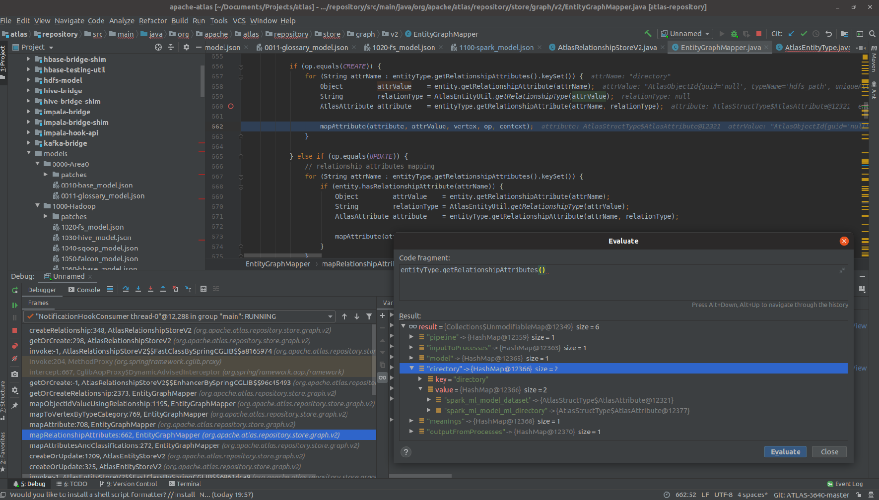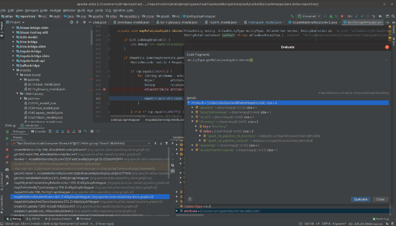 vladhlinsky commented on issue #88: ATLAS-3640 Update 'spark_ml_model_ml_directory' and 'spark_ml_pipeline_ml_directory' relationship definitions URL: https://github.com/apache/atlas/pull/88#issuecomment-592699723 Thanks, @HeartSaVioR! As it turned out, the proposed changes do not work correctly for an upgrade to Spark models 1.1. I tested the changes only for a new installation(with no existing entities in the HBase). I guess `relationshipCategory` can be updated only via a patch. An attempt to upgrade with proposed changes leads to: ``` 2020-02-28 09:57:11,783 ERROR - [main:] ~ graph rollback due to exception (GraphTransactionInterceptor:167) org.apache.atlas.exception.AtlasBaseException: invalid update for relationship spark_ml_model_ml_directory: new relationshipDef category AGGREGATION, existing relationshipDef category COMPOSITION at org.apache.atlas.repository.store.graph.v2.AtlasRelationshipDefStoreV2.preUpdateCheck(AtlasRelationshipDefStoreV2.java:432) ``` it's possible to use the following path to update this property ``` { "patches": [ { "id": "TYPEDEF_PATCH_1000_015_001", "description": "Update relationshipCategory to AGGREGATION", "action": "REMOVE_LEGACY_REF_ATTRIBUTES", "typeName": "spark_ml_model_ml_directory", "applyToVersion": "1.0", "updateToVersion": "1.1", "params": { "relationshipCategory": "AGGREGATION" } }, ... } ] } ``` however, there is no way to update `endDefs` types. I can not find a patch action for this purpose and an attempt to update it directly in the model file leads to: ``` 2020-02-28 12:14:05,151 INFO - [main:] ~ GraphTransaction intercept for org.apache.atlas.repository.store.graph.v2.AtlasTypeDefGraphStoreV2.createUpdateTypesDef (GraphTransactionAdvisor$1:41) 2020-02-28 12:14:05,213 ERROR - [main:] ~ graph rollback due to exception (GraphTransactionInterceptor:167) org.apache.atlas.exception.AtlasBaseException: invalid update for relationshipDef spark_ml_model_ml_directory: new end2 AtlasRelationshipEndDef{type='DataSet', name==>'model', description==>'null', isContainer==>'false', cardinality==>'SINGLE', isLegacyAttribute==>'false'}, existing end2 AtlasRelationshipEndDef{type='spark_ml_directory', name==>'model', description==>'null', isContainer==>'false', cardinality==>'SINGLE', isLegacyAttribute==>'false'} at org.apache.atlas.repository.store.graph.v2.AtlasRelationshipDefStoreV2.preUpdateCheck(AtlasRelationshipDefStoreV2.java:457) ``` Thus, it seems that the safest way to resolve this issue will be **creating a new relationship**. I tried to add the next relationship defs that use the same name `directory`: ``` { "name": "spark_ml_model_dataset", "serviceType": "spark", "typeVersion": "1.0", "relationshipCategory": "AGGREGATION", "endDef1": { "type": "spark_ml_model", "name": "directory", "isContainer": true, "cardinality": "SINGLE" }, "endDef2": { "type": "DataSet", "name": "model", "isContainer": false, "cardinality": "SINGLE" }, "propagateTags": "NONE" }, { "name": "spark_ml_pipeline_dataset", "serviceType": "spark", "typeVersion": "1.0", "relationshipCategory": "AGGREGATION", "endDef1": { "type": "spark_ml_pipeline", "name": "directory", "isContainer": true, "cardinality": "SINGLE" }, "endDef2": { "type": "DataSet", "name": "pipeline", "isContainer": false, "cardinality": "SINGLE" }, "propagateTags": "NONE" } ``` and it works perfectly fine for the `spark_ml_model` but fails for the `spark_ml_pipeline` with the following error: ``` 2020-02-28 21:34:00,933 WARN - [NotificationHookConsumer thread-0:] ~ Max retries exceeded for message {"version":{"version":"1.0.0","versionParts":[1]},"msgCompressionKind":"NONE","msgSplitIdx":1,"msgSplitCount":1,"msgCreationTime":1582918440918,"message":{"type":"ENTITY_CREATE_V2","user":"test","entities":{"entities":[{"typeName":"spark_ml_model","attributes":{"qualifiedName":"model_with_path8","name":"model_with_path8"},"guid":"-386799758271978","isIncomplete":false,"provenanceType":0,"version":0,"relationshipAttributes":{"directory":{"typeName":"hdfs_path","uniqueAttributes":{"qualifiedName":"path8"}}},"proxy":false}]}}} (NotificationHookConsumer$HookConsumer:793) org.apache.atlas.exception.AtlasBaseException: invalid relationshipDef: spark_ml_model_ml_directory: end type 1: spark_ml_directory, end type 2: spark_ml_model at org.apache.atlas.repository.store.graph.v2.AtlasRelationshipStoreV2.validateRelationship(AtlasRelationshipStoreV2.java:657) ``` Debugging shows that [AtlasEntityUtil.getRelationshipType](https://github.com/apache/atlas/blob/master/repository/src/main/java/org/apache/atlas/repository/store/graph/v2/EntityGraphMapper.java#L659) returns `null` for the `hdfs_path`(which is child of `DataSet`) attribute and this makes [entityType.getRelationshipAttribute](https://github.com/apache/atlas/blob/master/intg/src/main/java/org/apache/atlas/type/AtlasEntityType.java#L459) return first value of HashMap. In the case of `spark_ml_model` relation, it appears to be the right relation, but in the case of `spark_ml_pipeline` - the wrong one. See screenshots: