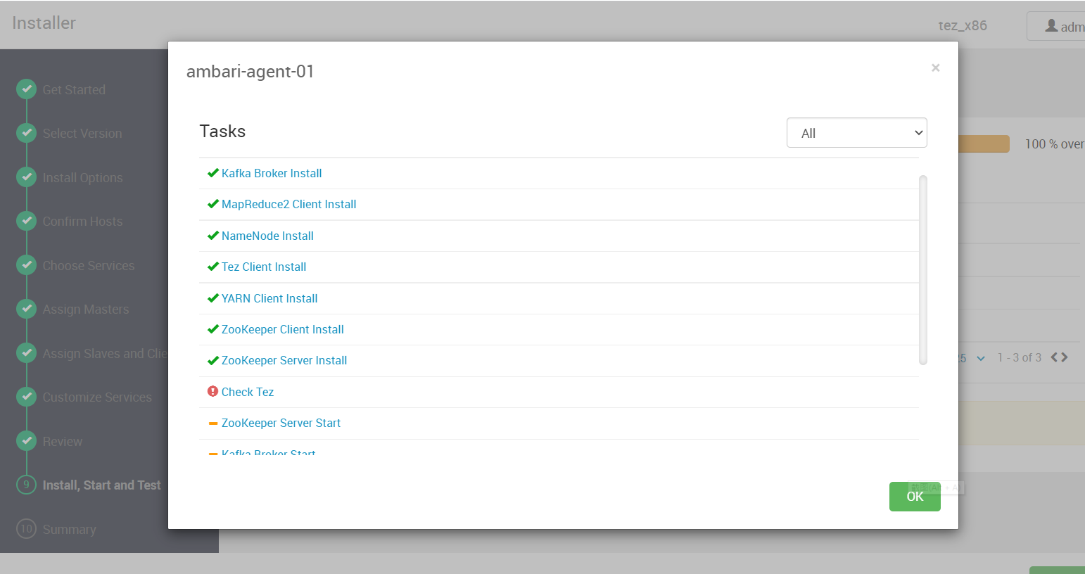 There are some issues on Checking Tez:  Log: ``` 2022-07-18 07:29:44,615 - File['/var/lib/ambari-agent/tmp/sample-tez-test'] {'content': 'foo\nbar\nfoo\nbar\nfoo', 'mode': 0755} 2022-07-18 07:29:44,617 - Writing File['/var/lib/ambari-agent/tmp/sample-tez-test'] because it doesn't exist 2022-07-18 07:29:44,617 - Changing permission for /var/lib/ambari-agent/tmp/sample-tez-test from 644 to 755 2022-07-18 07:29:44,618 - HdfsResource['/tmp/tezsmokeoutput'] {'security_enabled': False, 'hadoop_bin_dir': '/usr/bin', 'keytab': [EMPTY], 'dfs_type': 'HDFS', 'default_fs': 'hdfs://ambari-agent-01:8020', 'hdfs_resource_ignore_file': '/var/lib/ambari-agent/data/.hdfs_resource_ignore', 'hdfs_site': ..., 'kinit_path_local': '/usr/bin/kinit', 'principal_name': [EMPTY], 'user': 'hdfs', 'action': ['delete_on_execute'], 'hadoop_conf_dir': '/etc/hadoop/conf', 'type': 'directory', 'immutable_paths': [u'/mr-history/done', u'/app-logs', u'/tmp']} 2022-07-18 07:29:44,629 - call['ambari-sudo.sh su hdfs -l -s /bin/bash -c 'curl -sS -L -w '"'"'%{http_code}'"'"' -X GET -d '"'"''"'"' -H '"'"'Content-Length: 0'"'"' '"'"'http://ambari-agent-01:50070/webhdfs/v1/tmp/tezsmokeoutput?op=GETFILESTATUS&user.name=hdfs'"'"' 1>/tmp/tmp3M81cO 2>/tmp/tmpaAtCg6''] {'logoutput': None, 'quiet': False} 2022-07-18 07:29:44,687 - call returned (7, '') ``` ``` Traceback (most recent call last): File "/var/lib/ambari-agent/cache/stacks/BGTP/1.0/services/TEZ/package/scripts/service_check.py", line 125, in <module> TezServiceCheck().execute() File "/usr/lib/ambari-agent/lib/resource_management/libraries/script/script.py", line 352, in execute method(env) File "/var/lib/ambari-agent/cache/stacks/BGTP/1.0/services/TEZ/package/scripts/service_check.py", line 56, in service_check type = "directory" File "/usr/lib/ambari-agent/lib/resource_management/core/base.py", line 166, in __init__ self.env.run() File "/usr/lib/ambari-agent/lib/resource_management/core/environment.py", line 160, in run self.run_action(resource, action) File "/usr/lib/ambari-agent/lib/resource_management/core/environment.py", line 124, in run_action provider_action() File "/usr/lib/ambari-agent/lib/resource_management/libraries/providers/hdfs_resource.py", line 680, in action_delete_on_execute self.action_delayed("delete") File "/usr/lib/ambari-agent/lib/resource_management/libraries/providers/hdfs_resource.py", line 674, in action_delayed self.get_hdfs_resource_executor().action_delayed(action_name, self) File "/usr/lib/ambari-agent/lib/resource_management/libraries/providers/hdfs_resource.py", line 373, in action_delayed self.action_delayed_for_nameservice(None, action_name, main_resource) File "/usr/lib/ambari-agent/lib/resource_management/libraries/providers/hdfs_resource.py", line 395, in action_delayed_for_nameservice self._assert_valid() File "/usr/lib/ambari-agent/lib/resource_management/libraries/providers/hdfs_resource.py", line 334, in _assert_valid self.target_status = self._get_file_status(target) File "/usr/lib/ambari-agent/lib/resource_management/libraries/providers/hdfs_resource.py", line 497, in _get_file_status list_status = self.util.run_command(target, 'GETFILESTATUS', method='GET', ignore_status_codes=['404'], assertable_result=False) File "/usr/lib/ambari-agent/lib/resource_management/libraries/providers/hdfs_resource.py", line 214, in run_command return self._run_command(*args, **kwargs) File "/usr/lib/ambari-agent/lib/resource_management/libraries/providers/hdfs_resource.py", line 282, in _run_command _, out, err = get_user_call_output(cmd, user=self.run_user, logoutput=self.logoutput, quiet=False) File "/usr/lib/ambari-agent/lib/resource_management/libraries/functions/get_user_call_output.py", line 62, in get_user_call_output raise ExecutionFailed(err_msg, code, files_output[0], files_output[1]) resource_management.core.exceptions.ExecutionFailed: Execution of 'curl -sS -L -w '%{http_code}' -X GET -d '' -H 'Content-Length: 0' 'http://ambari-agent-01:50070/webhdfs/v1/tmp/tezsmokeoutput?op=GETFILESTATUS&user.name=hdfs' 1>/tmp/tmp3M81cO 2>/tmp/tmpaAtCg6' returned 7. curl: (7) Failed connect to ambari-agent-01:50070; Connection refused 000 ``` -- This is an automated message from the Apache Git Service. To respond to the message, please log on to GitHub and use the URL above to go to the specific comment. To unsubscribe, e-mail: [email protected] For queries about this service, please contact Infrastructure at: [email protected]