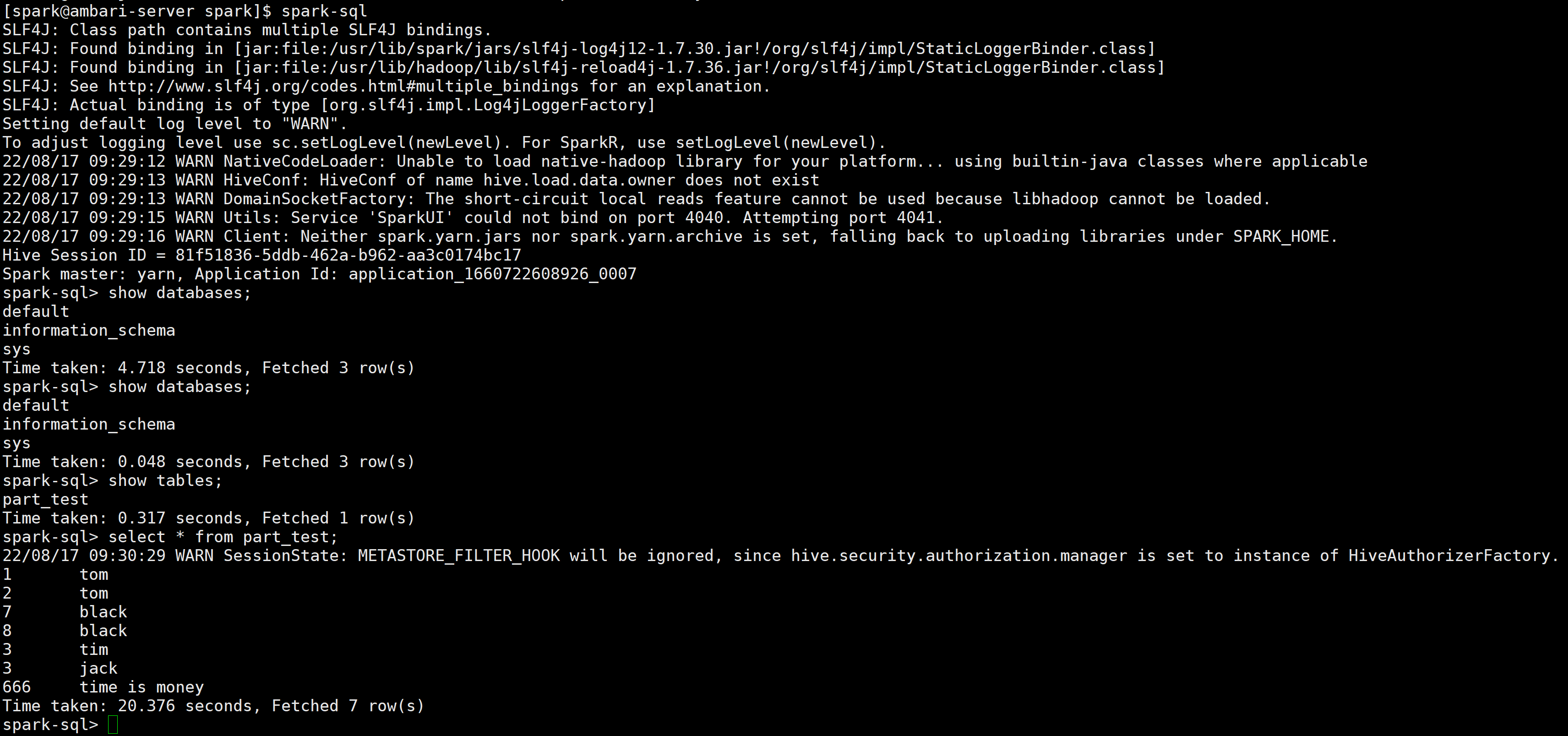 Spark Thrift Server Check  Spark submit Check ```bash [spark@ambari-server spark]$ ./bin/spark-submit --class org.apache.spark.examples.SparkPi --master yarn --deploy-mode client --queue default examples/jars/spark-examples.jar 10 SLF4J: Class path contains multiple SLF4J bindings. SLF4J: Found binding in [jar:file:/usr/lib/spark/jars/slf4j-log4j12-1.7.30.jar!/org/slf4j/impl/StaticLoggerBinder.class] SLF4J: Found binding in [jar:file:/usr/lib/hadoop/lib/slf4j-reload4j-1.7.36.jar!/org/slf4j/impl/StaticLoggerBinder.class] SLF4J: See http://www.slf4j.org/codes.html#multiple_bindings for an explanation. SLF4J: Actual binding is of type [org.slf4j.impl.Log4jLoggerFactory] 22/08/17 09:08:03 INFO SparkContext: Running Spark version 3.2.1 22/08/17 09:08:03 WARN NativeCodeLoader: Unable to load native-hadoop library for your platform... using builtin-java classes where applicable 22/08/17 09:08:03 INFO ResourceUtils: ============================================================== 22/08/17 09:08:03 INFO ResourceUtils: No custom resources configured for spark.driver. 22/08/17 09:08:03 INFO ResourceUtils: ============================================================== 22/08/17 09:08:03 INFO SparkContext: Submitted application: Spark Pi 22/08/17 09:08:03 INFO ResourceProfile: Default ResourceProfile created, executor resources: Map(cores -> name: cores, amount: 1, script: , vendor: , memory -> name: memory, amount: 1024, script: , vendor: , offHeap -> name: offHeap, amount: 0, script: , vendor: ), task resources: Map(cpus -> name: cpus, amount: 1.0) 22/08/17 09:08:03 INFO ResourceProfile: Limiting resource is cpus at 1 tasks per executor 22/08/17 09:08:03 INFO ResourceProfileManager: Added ResourceProfile id: 0 22/08/17 09:08:03 INFO SecurityManager: Changing view acls to: spark 22/08/17 09:08:03 INFO SecurityManager: Changing modify acls to: spark 22/08/17 09:08:03 INFO SecurityManager: Changing view acls groups to: 22/08/17 09:08:03 INFO SecurityManager: Changing modify acls groups to: 22/08/17 09:08:03 INFO SecurityManager: SecurityManager: authentication disabled; ui acls disabled; users with view permissions: Set(spark); groups with view permissions: Set(); users with modify permissions: Set(spark); groups with modify permissions: Set() 22/08/17 09:08:04 INFO Utils: Successfully started service 'sparkDriver' on port 41738. 22/08/17 09:08:04 INFO SparkEnv: Registering MapOutputTracker 22/08/17 09:08:04 INFO SparkEnv: Registering BlockManagerMaster 22/08/17 09:08:04 INFO BlockManagerMasterEndpoint: Using org.apache.spark.storage.DefaultTopologyMapper for getting topology information 22/08/17 09:08:04 INFO BlockManagerMasterEndpoint: BlockManagerMasterEndpoint up 22/08/17 09:08:04 INFO SparkEnv: Registering BlockManagerMasterHeartbeat 22/08/17 09:08:04 INFO DiskBlockManager: Created local directory at /tmp/blockmgr-89afb528-910d-47a3-92a9-d3c329250a5a 22/08/17 09:08:04 INFO MemoryStore: MemoryStore started with capacity 366.3 MiB 22/08/17 09:08:04 INFO SparkEnv: Registering OutputCommitCoordinator 22/08/17 09:08:04 INFO log: Logging initialized @3291ms to org.sparkproject.jetty.util.log.Slf4jLog 22/08/17 09:08:04 INFO Server: jetty-9.4.43.v20210629; built: 2021-06-30T11:07:22.254Z; git: 526006ecfa3af7f1a27ef3a288e2bef7ea9dd7e8; jvm 1.8.0_332-b09 22/08/17 09:08:04 INFO Server: Started @3449ms 22/08/17 09:08:04 WARN Utils: Service 'SparkUI' could not bind on port 4040. Attempting port 4041. 22/08/17 09:08:04 INFO AbstractConnector: Started ServerConnector@39aa45a1{HTTP/1.1, (http/1.1)}{0.0.0.0:4041} 22/08/17 09:08:04 INFO Utils: Successfully started service 'SparkUI' on port 4041. 22/08/17 09:08:04 INFO ContextHandler: Started o.s.j.s.ServletContextHandler@14faa38c{/jobs,null,AVAILABLE,@Spark} 22/08/17 09:08:04 INFO ContextHandler: Started o.s.j.s.ServletContextHandler@759d81f3{/jobs/json,null,AVAILABLE,@Spark} 22/08/17 09:08:04 INFO ContextHandler: Started o.s.j.s.ServletContextHandler@5a4c638d{/jobs/job,null,AVAILABLE,@Spark} 22/08/17 09:08:04 INFO ContextHandler: Started o.s.j.s.ServletContextHandler@1f12e153{/jobs/job/json,null,AVAILABLE,@Spark} 22/08/17 09:08:04 INFO ContextHandler: Started o.s.j.s.ServletContextHandler@5a101b1c{/stages,null,AVAILABLE,@Spark} 22/08/17 09:08:04 INFO ContextHandler: Started o.s.j.s.ServletContextHandler@29f0802c{/stages/json,null,AVAILABLE,@Spark} 22/08/17 09:08:04 INFO ContextHandler: Started o.s.j.s.ServletContextHandler@60f2e0bd{/stages/stage,null,AVAILABLE,@Spark} 22/08/17 09:08:04 INFO ContextHandler: Started o.s.j.s.ServletContextHandler@203dd56b{/stages/stage/json,null,AVAILABLE,@Spark} 22/08/17 09:08:04 INFO ContextHandler: Started o.s.j.s.ServletContextHandler@6d64b553{/stages/pool,null,AVAILABLE,@Spark} 22/08/17 09:08:04 INFO ContextHandler: Started o.s.j.s.ServletContextHandler@1d3e6d34{/stages/pool/json,null,AVAILABLE,@Spark} 22/08/17 09:08:04 INFO ContextHandler: Started o.s.j.s.ServletContextHandler@26a94fa5{/storage,null,AVAILABLE,@Spark} 22/08/17 09:08:04 INFO ContextHandler: Started o.s.j.s.ServletContextHandler@2873d672{/storage/json,null,AVAILABLE,@Spark} 22/08/17 09:08:04 INFO ContextHandler: Started o.s.j.s.ServletContextHandler@577f9109{/storage/rdd,null,AVAILABLE,@Spark} 22/08/17 09:08:04 INFO ContextHandler: Started o.s.j.s.ServletContextHandler@757529a4{/storage/rdd/json,null,AVAILABLE,@Spark} 22/08/17 09:08:04 INFO ContextHandler: Started o.s.j.s.ServletContextHandler@5c41d037{/environment,null,AVAILABLE,@Spark} 22/08/17 09:08:04 INFO ContextHandler: Started o.s.j.s.ServletContextHandler@5ec77191{/environment/json,null,AVAILABLE,@Spark} 22/08/17 09:08:04 INFO ContextHandler: Started o.s.j.s.ServletContextHandler@1450078a{/executors,null,AVAILABLE,@Spark} 22/08/17 09:08:04 INFO ContextHandler: Started o.s.j.s.ServletContextHandler@69c6161d{/executors/json,null,AVAILABLE,@Spark} 22/08/17 09:08:04 INFO ContextHandler: Started o.s.j.s.ServletContextHandler@2e1792e7{/executors/threadDump,null,AVAILABLE,@Spark} 22/08/17 09:08:04 INFO ContextHandl