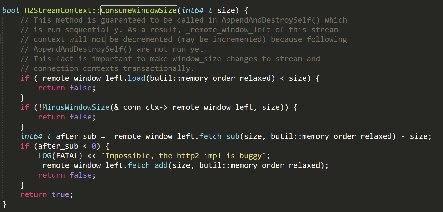 supernovaer commented on issue #715: http2 / grpc问题 URL: https://github.com/apache/incubator-brpc/issues/715#issuecomment-511739962 gdb断点看了下,进到H2StreamContext::ConsumeWindowSize这个函数的时候,第一个判断条件就没通过,_remote_window_left已经小于size了。  实际各个变量的情况如下图:  与H2StreamContext关联的H2Context对象_conn_ctx的_unack_local_settings里面初始化几个的window_size变量,值都是对的,是我通过h2_client_stream_window_size、h2_client_connection_window_size这两个gflag传进去的值,均>10M。 但是_remote_window_left的值却很小,百K级别,并且在第一次请求的时候,_remote_window_left就这么小了,导致一直报 ”remote_window_left is not enough“的错。 另外,每次请求虽然失败了,但最后还是触发了H2Context::OnSettings,从grpc server端ParseH2Settings(H2Settings* out, butil::IOBufBytesIterator& it, size_t n)这个函数也执行到了out->stream_window_size = value;这里,value也是M级别的,跟grpc server的配置是吻合的。 const int64_t window_diff = static_cast<int64_t>(_remote_settings.stream_window_size) - old_stream_window_size; window_diff的计算结果正常,也成功触发了AddWindowSize,但是下一次请求仍然是”remote_window_left is not enough“