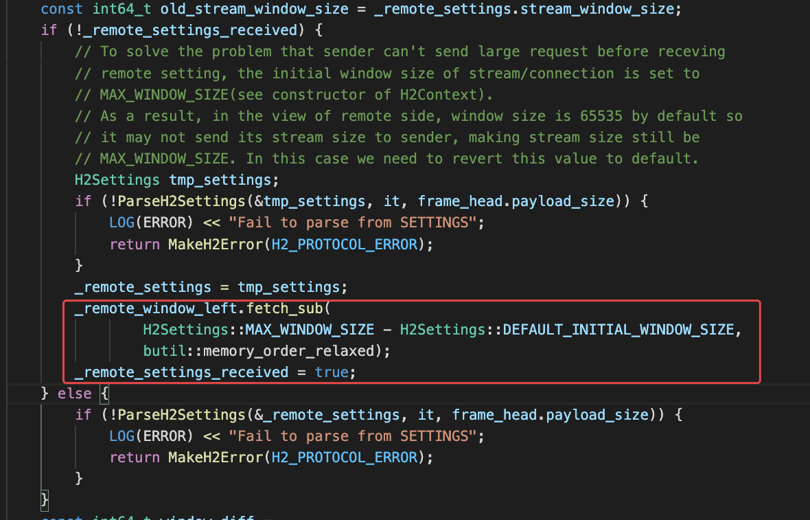 > 找一下grpc server的h2 window_size的配置,然后把这个值调大就可以了。你的场景应该是client向grpc server发大包,默认情况下server端这个窗口是很小的(64K),需要手动调大。 grpc server 端把stream_window_size 调大也没有效果,还是没发多次发送大包(超过50KB), brpc client这边的流控看着是connection 级别的 remote_window_left限制的原因,个人理解,每个http2连接开始时应该先接收到服务端的setting确定接收方的流控窗口大小,settting 初始化remote_window_left 如下代码所示:  图中所标注的代码行,为什么不直接写成如下: _remote_window_left.store(H2Settings::DEFAULT_INITIAL_WINDOW_SIZE, butil::memory_order_relaxed); @zyearn 麻烦大佬解惑,谢谢 ---------------------------------------------------------------- This is an automated message from the Apache Git Service. To respond to the message, please log on to GitHub and use the URL above to go to the specific comment. For queries about this service, please contact Infrastructure at: [email protected] --------------------------------------------------------------------- To unsubscribe, e-mail: [email protected] For additional commands, e-mail: [email protected]