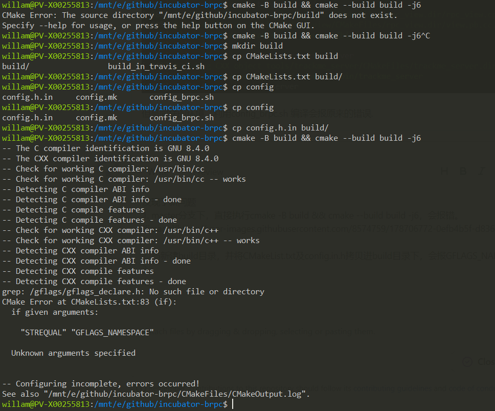 发现了新问题 1. master分支下,直接执行cmake -B build && cmake --build build -j6,会报错。  2. 当新建build目录,并将CMakeList.txt及config.h.in拷贝进build目录下,会报GFLAGS_NAMESPACE错.  3. 不使用"cmake -B build && cmake --build build -j6", 使用mkdir bld && cd bld && cmake .. && make是可以编译的 -- This is an automated message from the Apache Git Service. To respond to the message, please log on to GitHub and use the URL above to go to the specific comment. To unsubscribe, e-mail: [email protected] For queries about this service, please contact Infrastructure at: [email protected] --------------------------------------------------------------------- To unsubscribe, e-mail: [email protected] For additional commands, e-mail: [email protected]