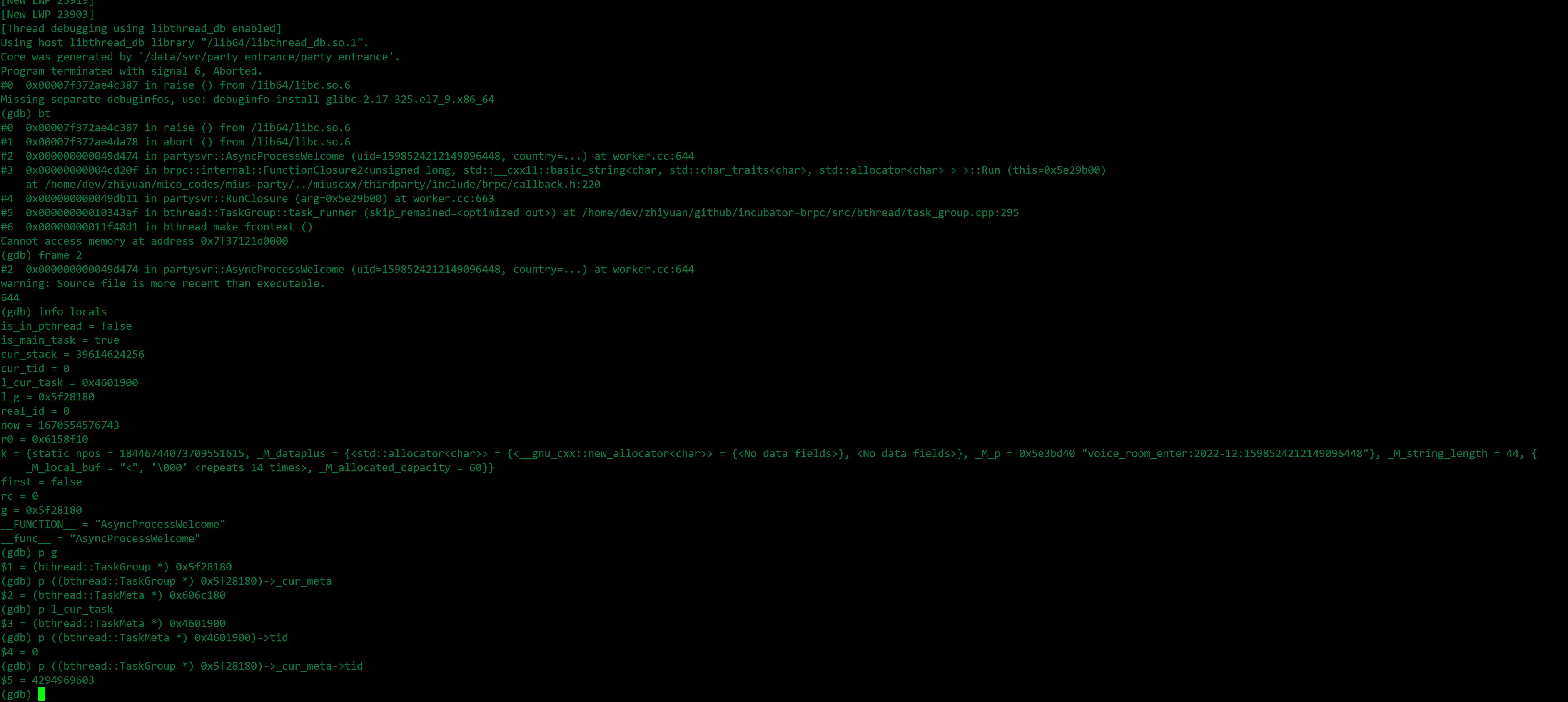 > 再对比一下g、g->current_task()在日志和在gdb中的值看看  -- This is an automated message from the Apache Git Service. To respond to the message, please log on to GitHub and use the URL above to go to the specific comment. To unsubscribe, e-mail: [email protected] For queries about this service, please contact Infrastructure at: [email protected] --------------------------------------------------------------------- To unsubscribe, e-mail: [email protected] For additional commands, e-mail: [email protected]