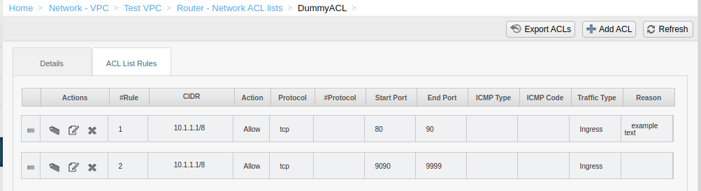 rhtyd opened a new issue #132: VPC: Network ACL List Management URL: https://github.com/apache/cloudstack-primate/issues/132 Implement network ACL list rules management tab (to create ACL rule, list, update/change order and delete...). Old UI -> network -> select VPC from dropdown -> select VPC to manage -> select ACL list (in router box on left) -> ACL list... (In Primate, go to Network -> VPC -> View ACLs button on info card -> ACL list...)  Refer to stubs: https://github.com/apache/cloudstack-primate/commit/55c0b75fb6a7ec619784fe55a566487bb3d4a822