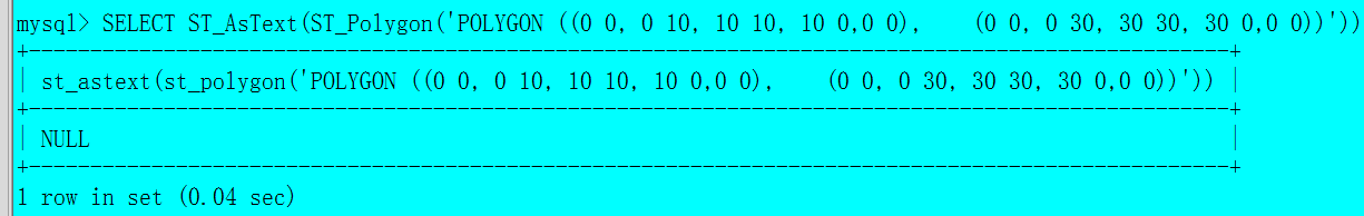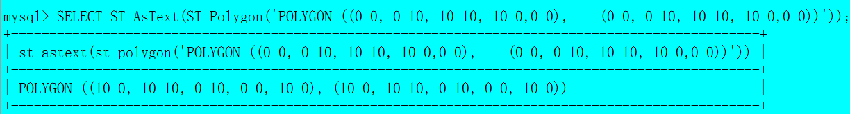 manannan2017 opened a new issue #1609: POLYGON function:when 2 pairs of data is different,the result is NULL always URL: https://github.com/apache/incubator-doris/issues/1609 steps: 1、doris 1》 2 pairs of data is different SELECT ST_AsText(ST_Polygon('POLYGON ((0 0, 0 10, 10 10, 10 0,0 0), (0 0, 0 30, 30 30, 30 0,0 0))'));  2》 2 pairs of data is same SELECT ST_AsText(ST_Polygon('POLYGON ((0 0, 0 10, 10 10, 10 0,0 0), (0 0, 0 10, 10 10, 10 0,0 0))'));  2、mysql 1》 2 pairs of data is different SELECT ST_AsText(GEOMFROMTEXT('POLYGON ((0 0, 0 10, 10 10, 10 0,0 0), (0 0, 0 30, 30 30, 30 0,0 0))'));  2》2 pairs of data is same it is same as doris
