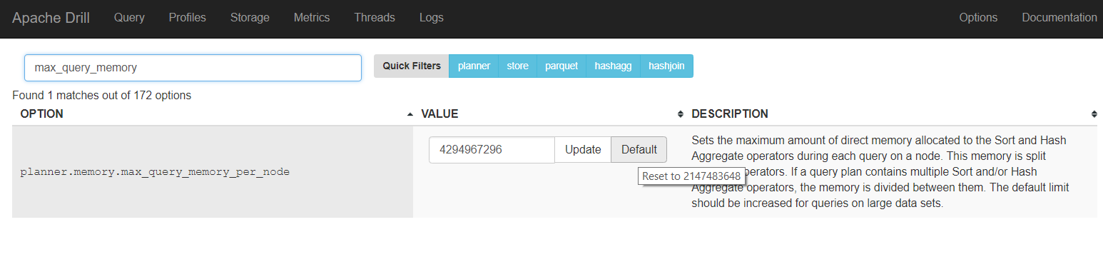 kkhatua opened a new pull request #1543: DRILL-6668: In Web UI, highlight options that are not default values URL: https://github.com/apache/drill/pull/1543 This commit introduces a new button on the options page that allows a user to reset an option to its system default value. To simplify things, a tooltip is shown when the mouse hovers over the button. If the option value is already default, the button is disabled.  In addition, a second commit refactor Update button functionality to use same code path and reuses what we already are using to set the default (using AJAX) and auto-refreshing