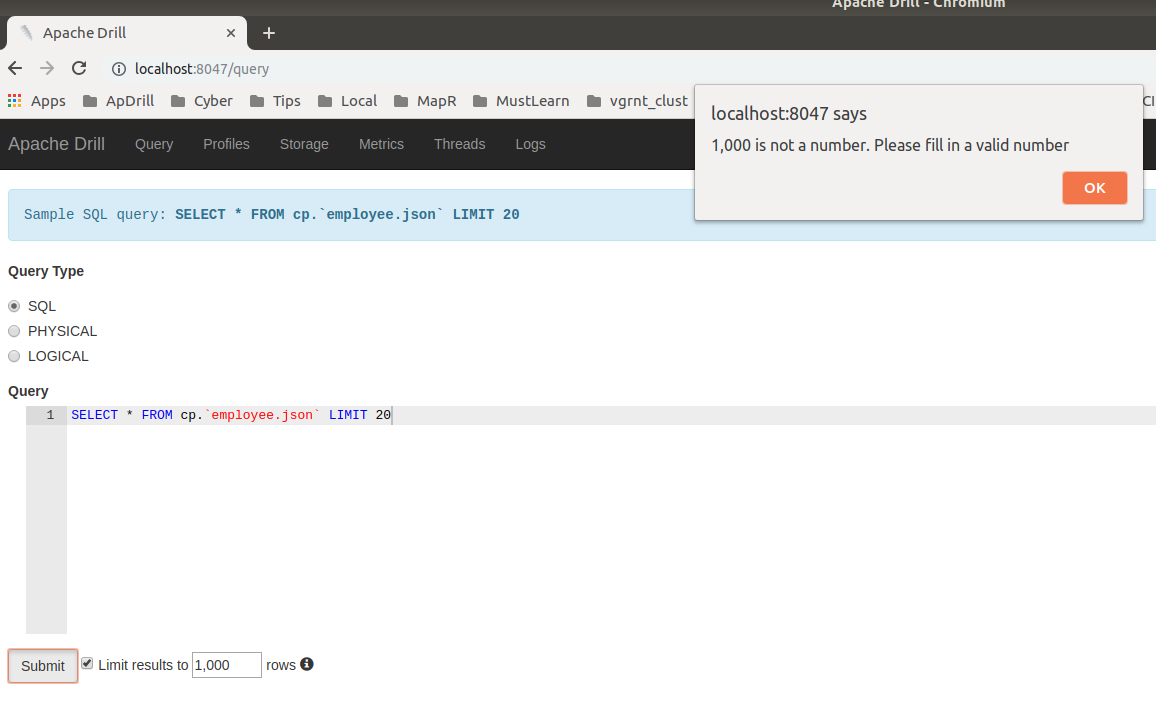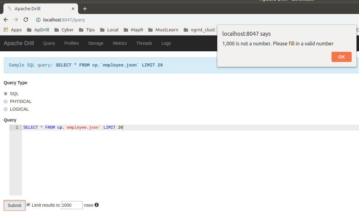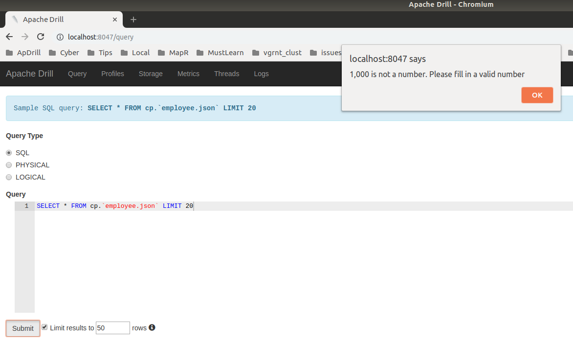 ihuzenko commented on issue #1608: DRILL-6960: Auto Limit Wrapping should not apply to non-select query URL: https://github.com/apache/drill/pull/1608#issuecomment-458127161 Hello @kkhatua , sorry for the late answer. I wanted to start review from check that fix works fine, but suddenly bumped into an issue. I wasn't able to submit query with my current locale, because it affects number formatting. 1. Tried to use default number:  2. Tried to remove comma from default number:  3. Tried to use own auto limit 50 :  After those failed attempts I executed the line ```console.log(window.navigator.userLanguage || window.navigator.language)``` in JS console and got locale ```en-US``` in my chromium-browser. @kkhatua, can you please fix the blocking issue in order to unlock further review ? Thank you in advance, Igor.