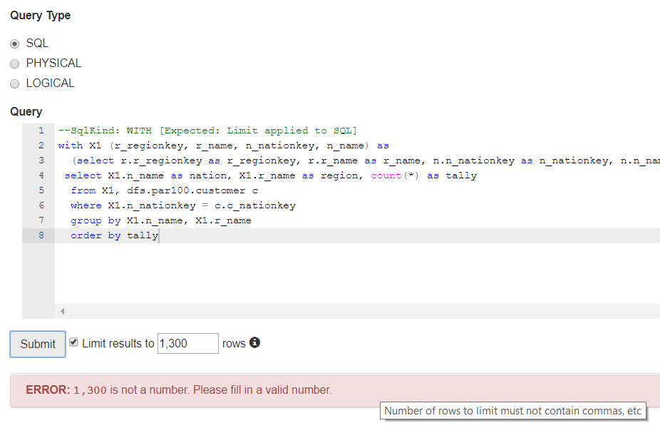 kkhatua commented on issue #1608: DRILL-6960: AutoLimit the size of ResultSet for a WebUI (or REST) client URL: https://github.com/apache/drill/pull/1608#issuecomment-461892922 **Screenshot of Error Handling:**  **Screenshot of results for the query** ```sql -- Simple Join with existing Limit 22 [Expected: Limit 13 applied to SQL] select r.r_regionkey as r_regionkey, r.r_name as r_name, n.n_nationkey as n_nationkey, n.n_name as n_name from dfs.par100.region r, dfs.par100.nation n where r.r_regionkey=n.n_regionkey limit 22 ```  **Screenshot of profile with Limit applied (overriding the existing larger limit 22)**