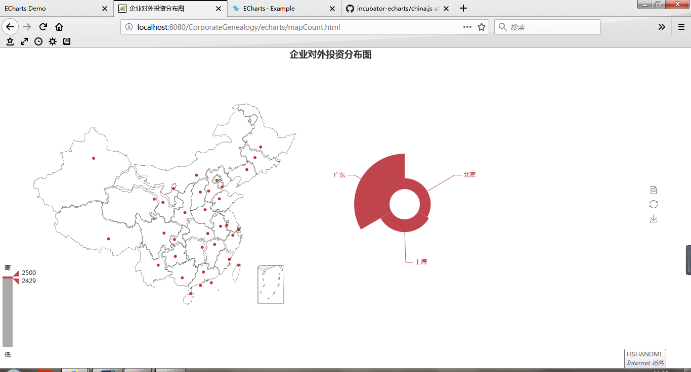 fwfm opened a new issue #8443: 地图显示问题 URL: https://github.com/apache/incubator-echarts/issues/8443 <!-- 为了方便我们能够复现和修复 bug,请遵从下面的规范描述您的问题。 --> ### One-line summary [问题简述] 在引用中国地图的js库之后,显示到页面时各省份之间出现空隙。 ### Version & Environment [版本及环境] + ECharts version [ECharts 版本]: + Browser version [浏览器类型和版本]: + OS Version [操作系统类型和版本]: ### Expected behaviour [期望结果] ### ECharts option [ECharts配置项] <!-- Copy and paste your 'echarts option' here. --> <!-- [下方贴你的option,注意不要删掉下方 ```javascript 和 尾部的 ``` 字样。最好是我们能够直接运行的 option。如何得到能运行的 option 参见上方的 guidelines for contributing] --> ```javascript option = { title : { text: '企业对外投资分布图', left: 'center' }, tooltip : { trigger: 'item' }, legend: { orient: 'vertical', left: 'left', data:[], selectedMode: false }, visualMap: { min: 0, max: 2500, left: 'left', top: 'bottom', text:['高','低'], // 文本,默认为数值文本 calculable : true }, toolbox: { show: true, orient : 'vertical', left: 'right', top: 'center', feature : { mark : {show: true}, dataView : {show: true, readOnly: false}, restore : {show: true}, saveAsImage : {show: true} } }, series : [ { name: 'iphone3', type: 'map', mapType: 'china', roam: false, zoom:0.8, left: 0, label: { normal: { show: false }, emphasis: { show: true } }, data: data },{ name:'2011全国GDP对比', type:'pie', roseType : 'area', tooltip: { trigger: 'item', formatter: "{a} <br/>{b} : {c} ({d}%)" }, center:['800','50%'], radius: [30, 100], data:[ {name: '北京', value: 16251.93}, {name: '上海', value: 19195.69}, {name: '广东', value: 53210.28} ] } ] } ``` ### Other comments [其他信息] <!-- For example: Screenshot or Online demo --> <!-- [例如,截图或线上实例 (JSFiddle/JSBin/Codepen)] -->