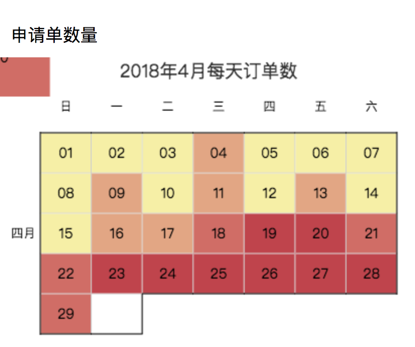 windend opened a new issue #9024: 小程序日历坐标系用heatmap,最后一天渲染不全 URL: https://github.com/apache/incubator-echarts/issues/9024 <!-- 为了方便我们能够复现和修复 bug,请遵从下面的规范描述您的问题。 --> ### One-line summary [问题简述] 小程序日历坐标系用heatmap,最后一天渲染不全 ### Version & Environment [版本及环境] + ECharts version [ECharts 版本]: + Browser version [浏览器类型和版本]: + OS Version [操作系统类型和版本]: ### Expected behaviour [期望结果] ### ECharts option [ECharts配置项] <!-- Copy and paste your 'echarts option' here. --> <!-- [下方贴你的option,注意不要删掉下方 ```javascript 和 尾部的 ``` 字样。最好是我们能够直接运行的 option。如何得到能运行的 option 参见上方的 guidelines for contributing] --> ```javascript option = { title: { top: 'top', left: 'center', text: '2018年' + month + '月每天订单数' }, calendar: { top: 'middle', left: 40, right: 20, cellSize: [40], range: '2018-0' + month, orient: 'vertical', yearLabel: { show: false, }, monthLabel: { nameMap: 'cn' }, dayLabel: { nameMap: 'cn' } }, tooltip: { }, visualMap: { min: 0, max: 400, type: 'piecewise', orient: 'horizontal', left: 'center', bottom: 20, splitNumber: 4, }, legend: { legend: { data: ['工作', '娱乐', '睡觉'], bottom: 20 } }, series: { type: 'heatmap', coordinateSystem: 'calendar', data: datas.ordernums.slice(6, 36), label: { show: true, formatter: function(params) { return echarts.format.formatTime('dd', params.value[0]); }, textStyle: { color: '#000', fontSize: 14 } } } } ``` ### Other comments [其他信息] <!-- For example: Screenshot or Online demo --> <!-- [例如,截图或线上实例 (JSFiddle/JSBin/Codepen)] -->
