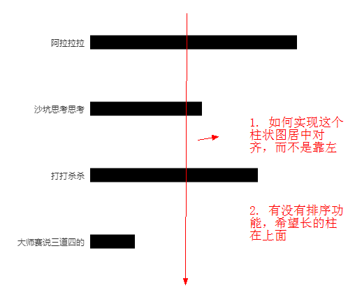 menciusKael opened a new issue #9038: 柱状图横向排,居中对齐 URL: https://github.com/apache/incubator-echarts/issues/9038  1. 柱状图,水平排版,然后如何居中对齐,而不是靠左对齐?? 2. 有没有排序功能,长一点的柱子在上面