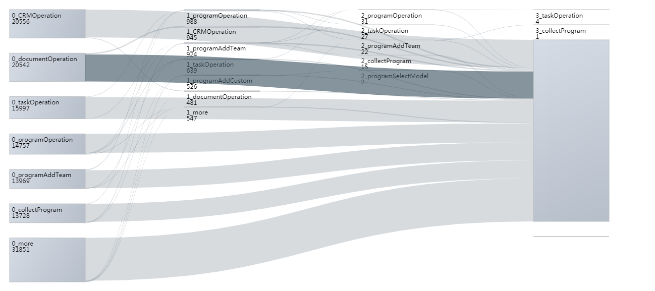 supercat1995 opened a new issue #9374: 如何让sankey图的边的层级低于节点的层级 URL: https://github.com/apache/incubator-echarts/issues/9374 <!-- 为了方便我们能够复现和修复 bug,请遵从下面的规范描述您的问题。 --> ### One-line summary [问题简述]  如何让sankey图的边的层级低于节点的层级,现在边会罩住节点导致没法选中节点 ### Version & Environment [版本及环境] + ECharts version [ECharts 版本]: 4.2.0 + Browser version [浏览器类型和版本]:Google Chrome 版本 67.0.3396.79(正式版本) (32 位) + OS Version [操作系统类型和版本]:windows7 sp1 ### Expected behaviour [期望结果] 边和节点的层级可调整 ### ECharts option [ECharts配置项] <!-- Copy and paste your 'echarts option' here. --> <!-- [下方贴你的option,注意不要删掉下方 ```javascript 和 尾部的 ``` 字样。最好是我们能够直接运行的 option。如何得到能运行的 option 参见上方的 guidelines for contributing] --> ```javascript <template> <div class="index"> <div id="path1"> </div> </div> </template> <script> export default { name: 'index', data() { return { sankeyData: { sankeyParams: {}, opdata: [{ name: 'a', value: [27, 2, false] }, { name: 'b1', value: [10, 2, false] }, { name: 'b2', value: [8, 1, false] }, { name: 'b3', value: [7, 1, false] }, { name: 'c1', value: [12, 1, false] }, { name: 'c2', value: [4, 1, false] }, { name: 'c3', value: [5, 1, false] }, { name: 'd1', value: [8, 0, false] }, { name: 'd2', value: [4, 0, false] }, { name: 'd3', value: [4, 0, false] }, { name: 'alost', itemStyle: { color: 'transparent', borderColor: 'transparent' }, label: { show: false } }, { name: 'dlost', itemStyle: { color: 'transparent', borderColor: 'transparent' }, label: { show: false } }], opctionLinks: [{ source: 'a', target: 'b1', value: [10, 27] }, { source: 'a', target: 'alost', value: 2, lineStyle: { color: new this.$echarts.graphic.LinearGradient(0, 0, 1, 0, [{ offset: 0, color: '#de181a' }, { offset: 0.03, color: 'transparent' }]) }, emphasis: { lineStyle: { opacity: '0.2' } } }, { source: 'a', target: 'b2', value: [8, 27] }, { source: 'a', target: 'b3', value: [7, 27] }, { source: 'b1', target: 'c1', value: [6, 10] }, { source: 'b1', target: 'alost', value: 2, lineStyle: { color: new this.$echarts.graphic.LinearGradient(0, 0, 1, 0, [{ offset: 0, color: '#de181a' }, { offset: 0.03, color: 'transparent' }]) }, emphasis: { lineStyle: { opacity: '0.2' } } }, { source: 'b2', target: 'alost', value: 1, lineStyle: { color: new this.$echarts.graphic.LinearGradient(0, 0, 1, 0, [{ offset: 0, color: '#de181a' }, { offset: 0.03, color: 'transparent' }]) }, emphasis: { lineStyle: { opacity: '0.2' } } }, { source: 'b3', target: 'alost', value: 1, lineStyle: { color: new this.$echarts.graphic.LinearGradient(0, 0, 1, 0, [{ offset: 0, color: '#de181a' }, { offset: 0.03, color: 'transparent' }]) }, emphasis: { lineStyle: { opacity: '0.2' } } }, { source: 'b1', target: 'c2', value: [1, 10] }, { source: 'b1', target: 'c3', value: [1, 10] }, { source: 'b2', target: 'c1', value: [4, 7] }, { source: 'b2', target: 'c2', value: [2, 7] }, { source: 'b2', target: 'c3', value: [1, 7] }, { source: 'b3', target: 'c1', value: [2, 6] }, { source: 'b3', target: 'c2', value: [1, 6] }, { source: 'b3', target: 'c3', value: [3, 6] }, { source: 'c1', target: 'd1', value: [5, 12] }, { source: 'c1', target: 'alost', value: 1, lineStyle: { color: new this.$echarts.graphic.LinearGradient(0, 0, 1, 0, [{ offset: 0, color: '#de181a' }, { offset: 0.03, color: 'transparent' }]) }, emphasis: { lineStyle: { opacity: '0.2' } } }, { source: 'c2', target: 'alost', value: 1, lineStyle: { color: new this.$echarts.graphic.LinearGradient(0, 0, 1, 0, [{ offset: 0, color: '#de181a' }, { offset: 0.03, color: 'transparent' }]) }, emphasis: { lineStyle: { opacity: '0.2' } } }, { source: 'c3', target: 'alost', value: 1, lineStyle: { color: new this.$echarts.graphic.LinearGradient(0, 0, 1, 0, [{ offset: 0, color: '#de181a' }, { offset: 0.03, color: 'transparent' }]) }, emphasis: { lineStyle: { opacity: '0.2' } } }, { source: 'c2', target: 'alost', value: 1, lineStyle: { color: new this.$echarts.graphic.LinearGradient(0, 0, 1, 0, [{ offset: 0, color: '#de181a' }, { offset: 0.03, color: 'transparent' }]) }, emphasis: { lineStyle: { opacity: '0.2' } } }, { source: 'c1', target: 'd2', value: [3, 12] }, { source: 'c1', target: 'd3', value: [3, 12] }, { source: 'c2', target: 'd1', value: [1, 4] }, { source: 'c2', target: 'd2', value: [1, 4] }, { source: 'c2', target: 'd3', value: [1, 4] }, { source: 'c3', target: 'd1', value: [2, 5] }, { source: 'c3', target: 'd2', value: [1, 5] }, { source: 'c3', target: 'd3', value: [1, 5] }] }, sankeyDataByGet: { nodes: [ [{ "id": "0_CRMOperation", "event_name": "CRMOperation", "times": 20556 }, { "id": "0_documentOperation", "event_name": "documentOperation", "times": 20542 }, { "id": "0_taskOperation", "event_name": "taskOperation", "times": 15997 }, { "id": "0_programOperation", "event_name": "programOperation", "times": 14757 }, { "id": "0_programAddTeam", "event_name": "programAddTeam", "times": 13969 }, { "id": "0_collectProgram", "event_name": "collectProgram", "times": 13728 }, { "id": "0_more", "event_name": "more", "times": 31851, "is_aggregate": true }], [{ "id": "1_programOperation", "event_name": "programOperation", "times": 988 }, { "id": "1_CRMOperation", "event_name": "CRMOperation", "times": 945 }, { "id": "1_programAddTeam", "event_name": "programAddTeam", "times": 924 }, { "id": "1_taskOperation", "event_name": "taskOperation", "times": 639 }, { "id": "1_programAddCustom", "event_name": "programAddCustom", "times": 526 }, { "id": "1_documentOperation", "event_name": "documentOperation", "times": 481 }, { "id": "1_more", "event_name": "more", "times": 547, "is_aggregate": true }], [{ "id": "2_programOperation", "event_name": "programOperation", "times": 31 }, { "id": "2_taskOperation", "event_name": "taskOpe