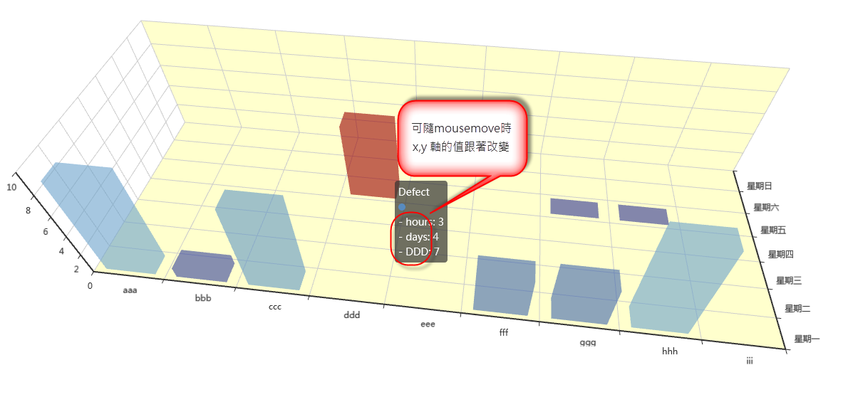 QVMark opened a new issue #9507: 希望滑鼠移到該數據的時候X,Y軸可隨著位置變換名稱 URL: https://github.com/apache/incubator-echarts/issues/9507 <!-- Thanks for choosing ECharts! 感谢使用 ECharts! It's highly recommended to use English in issues, to help others having the same problem in the future. 加入 Apache 开源基金会后,我们有了更多国外的用户。为了方便社区用户,强烈建议在 issue 中使用英文。 Please check the following questions to let our bot help. 请回答以下问题,以帮助我们的机器人维护 issue。 To check the option, add x in [ ], e.g.: [x] I am ... 勾选的方式:在 [ ] 中加入 x,变成:[x] I am ... 的形式。 --> - [ ] I am using English in this issue. 在这个 Issue 中我使用了英文(强烈建议)。 ## General Questions <!-- BEGINNING OF REQUIRED FIELDS 必填项开始 --> PLEASE MAKE SURE OF ALL THE FOLLOWING OPTIONS IN REQUIRED FIELDS ARE TICKED (with x)! Otherwise, the issue will not be answered. And think before you tick. :) 请确保以下每项都打上勾了!并且确保都做了这些事哦~ 这将大量简化我们的工作流程,使你的问题更快速得到解答。 - [v ] Required: I have read the document and examples and tried to solve it by myself. (必填)我读过了文档和教程,并且曾试图自己解决问题。 - [v ] Required: I have searched for similar issues and that didn't help. (必填)我搜索过 issue 但是没有帮助。 - [v ] Required: I have tried with the latest version of ECharts and still have this problem. (必填)我试过最新版本的 ECharts,还是存在这个问题。 In this issue, I have provided information with: 在这个 issue 中我提供了以下信息: - [v ] Required: issue type;(必填)issue 类型 - [v ] Required: one sentence description in issue details;(必填)一句话的问题描述 - [v ] Required: demo;(必填)能反映问题的例子(如果你想提问或报 bug) - [ ] Required: ECharts version;ECharts 版本 <!-- END OF REQUIRED FIELDS 必填项结束 --> ## Issue Type <!-- Add `x` for the ones that is true with you, e.g.: [x] I have ... --> - [ ] I have a question to ask about *how to use ECharts to ...*;我想提问如何使用 ECharts 实现某功能 - [ ] I have a bug to report;我想要报 bug - [ ] I have a feature to request, e.g.: *I'd like a new feature that ...*;我需要一个新功能 - [ ] I have a feature to enhance, e.g.: *The current feature should be improved in the way that ...*;我希望改进某个功能 - [ ] There's something wrong with the documents;文档有些问题 - [ ] Others, or I'm not sure which issue types to choose here;其他,或我不知道应该选什么类型 ## Issue Details 想請問如何能在3D柱狀圖中使用tooltip時欄位名稱可隨著XY軸一起變化,而不是固定XY軸的欄位名稱? ### Expected Behavior <!-- Add screenshots to demo if necessary. 期望的效果。 --> 希望滑鼠移到該數據的時候X,Y軸可隨著位置變換名稱 ### Current Behavior <!-- Add screenshots to demo if necessary. Otherwise, replace the following line with N/A. 现在的效果。 --> {DESCRIBE_HERE} ### Online Example <!-- Please use jsfiddle.net or gallery.echartsjs.com to provide a simplest demo to show the problem. And do not upload zip demos. 请使用 gallery.echartsjs.com 提供最简单可运行的代码,请不要上传 zip 文件。 --> THIS IS REQUIRED FOR ALL BUG REPORTS AND QUESTIONS!!! 如果是提问或报 bug 一定要提供这一项! {ADD_LINK_OF_DEMO_HERE} <!-- Please make your demo as simple as possible to help locate the problem. And paste only necessary part of code here. 提供必要的代码,不要全部粘贴。 --> {PASTE_RELATED_CODE_HERE} ## Topics <!-- Check those topics that are related. 选择相关主题。 --> - [ ] Legend - [v ] Tooltip - [ ] Event - [ ] Performance - [ ] SVG - [ ] Map - [v ] ECharts GL - [ ] Third-party libraries, e.g.: Vue.js, React ## Anything Else We Need to Know <!-- You may reference other issues here. Otherwise, replace the following line with N/A. 其他我们需要知道的东西,比如引用其他 issue。 --> {DESCRIBE_HERE} ## Environment Version & Environment [版本及环境] ECharts version [ECharts 版本]: 2.0 Browser version [浏览器类型和版本]: firefox 63.0.3 (32 bit) OS Version [操作系统类型和版本]: windows10  程式碼在底下link,再麻煩大神協助 https://codepen.io/qvmark/pen/VVRjqe