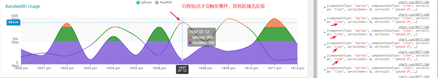 itAlvy edited a comment on issue #10838: vue中无法监听echarts事件 URL: https://github.com/apache/incubator-echarts/issues/10838#issuecomment-511302137 > 不是让你换框架,是看看这个是不是 vue 的问题 现在可以注册事件了, 使用两个事件**click**和**mousemove** 都可以,不过 **componentType** 都是为 **line** ,但是我想尝试在整个 **grid** 区域中都能触发。  ---  --- 而且只有点击或者移动到 **标点** 的时候才会触发