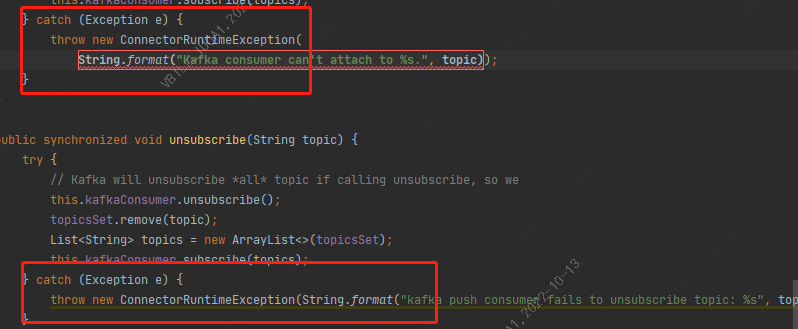 ### Search before asking - [X] I had searched in the [issues](https://github.com/apache/eventmesh/issues?q=is%3Aissue) and found no similar issues. ### Enhancement Request  located at: org/apache/eventmesh/connector/kafka/consumer/ConsumerImpl.java line 106 and 118 explanation: This method catches an exception, and throws a different exception, without incorporating the original exception. Doing so hides the original source of the exception, making debugging and fixing these problems difficult. ### Describe the solution you'd like We can consider using logger to record raw exception information. ### Are you willing to submit PR? - [ ] Yes I am willing to submit a PR! -- This is an automated message from the Apache Git Service. To respond to the message, please log on to GitHub and use the URL above to go to the specific comment. To unsubscribe, e-mail: [email protected] For queries about this service, please contact Infrastructure at: [email protected] --------------------------------------------------------------------- To unsubscribe, e-mail: [email protected] For additional commands, e-mail: [email protected]