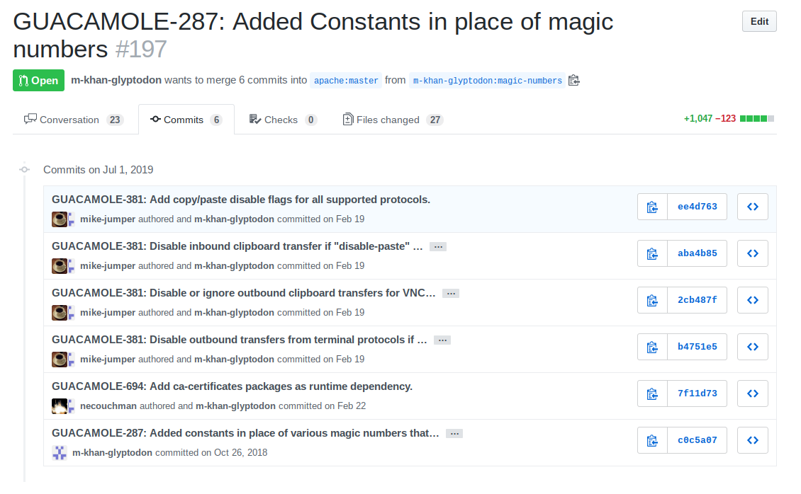 mike-jumper commented on issue #197: GUACAMOLE-287: Added Constants in place of magic numbers URL: https://github.com/apache/guacamole-server/pull/197#issuecomment-507416536 Your PR now includes rebased commits of other authors:  Please include only the commits relevant to the change at hand.