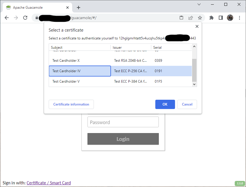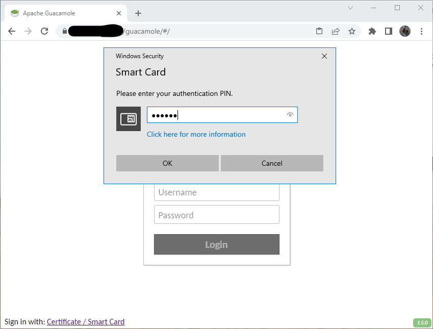 This change adds a new SSO extension that leverages SSL/TLS authentication to determine user identity. In practice, this means that users can sign in with a certificate issued to their browser by an employer or using a smart card and card reader (including PIV/CAC cards). **NOTE:** This _does not_ mean that you can pass through that authentication result to an RDP server that accepts smart cards. That's an entirely different can of worms. # Overall Authentication Flow If configured, users are presented with an option to log in with a smart card or certificate, similar to existing support for SAML, etc.:  Clicking on "Certificate / Smart Card" requests that the browser present a certificate to authentication, typically resulting in a prompt from the OS to select a card:  Authentication flow at that point is entirely between the OS, browser, and SSL termination. If the card requires a PIN, the OS should prompt you for that:  If everything checks out, the user is authenticated with a username extracted from the subject DN in their certificate:  If not, the user sees a typical authentication failure:  # How This Works SSL/TLS client authentication is both simple and complex. Requiring it is easy in principle - you just set up SSL termination with something like Nginx and configure your SSL termination to perform SSL client authentication. In practice, things are more complex: * The identity asserted via SSL/TLS client authentication is bound to that SSL session and may be cached by the browser or OS. * If the OS or browser does manage to cache the certificate, then another user that happens to use that same system after the previous user logs out could inherit their identity. * It is not possible for the application sitting behind SSL termination to force revalidation of the certificate. To protect against this, these changes _dynamically generate subdomains_. When you click the link to sign in with a smart card, Guacamole actually: 1. Generates a random subdomain with a lengthy nonce value. 2. Redirects you to that subdomain. 3. Verifies that (a) the certificate presented at that subdomain is valid and (b) the subdomain is a subdomain that we generated and has never been used before. 4. Regardless of the result of validation, the user is issued a temporary auth session token representing the authentication result. 5. The temporary session token is presented to the main domain as the user's credentials. If it represents a valid identity, the user is authenticated and the token is discarded. If not, authentication fails. Thus, any potentially cached credentials are tied to a unique subdomain that can only be used once, guaranteeing auth attempts always require fresh validation of the user's certificate. Prerequisites for configuring this are: * Wildcard DNS configured to point at the Guacamole server * A wildcard certificate that is valid for the Guacamole server * SSL termination pre-configured to request SSL/TLS client authentication for any subdomain of the Guacamole server, but _not_ for the Guacamole server itself. # Configuration Options ## Required * `ssl-primary-uri` - The URI of this instance without SSL/TLS client authentication required. This must be a URI that points to THIS instance of Guacamole, but behind SSL termination that DOES NOT require or request SSL/TLS client authentication. * `ssl-client-auth-uri` - The URI that should be used to authenticate users with SSL/TLS client authentication. This must be a URI that points to THIS instance of Guacamole, but behind SSL termination that requires SSL/TLS client authentication, and the domain must start with a wildcard (which Guacamole will replace with uniquely-generated subdomains). ## Optional * `ssl-subject-username-attribute` - A comma-separated list of all attributes that may contain the user's username in the subject DN of their certificate. The least-significant (leftmost) attribute of the DN is always used, so a subject DN without one of these attributes in the leftmost position will not be accepted at all. By default, all attributes are allowed. * `ssl-subject-base-dn` - The base DN to require of any subject DN. Only subject DNs beneath this base DN will be accepted. By default, no restriction is placed on the subject DN. * `ssl-client-certificate-header` - The name of the header to use to retrieve the URL-encoded client certificate from an HTTP request received from the SSL termination service. This defaults to `X-Client-Certificate`/ * `ssl-client-verified-header` - The name of the header containing the validation result from the SSL termination service. The value of this header must be either `SUCCESS` (successful), `NONE` (no certificate present), or `FAILED:reason` where "reason" is a description of the error. Guacamole will assume that any value that doesn't match these represents generic failure. By default, the header `X-Client-Verified` is used. * `ssl-max-domain-validity` - The maximum amount of time that a generated subdomain should remain valid if left unused, in minutes. By default, domains are valid for 5 minutes. Each subdomain immediately ceases to be valid upon use. * `ssl-max-token-validity` - The maximum amount of time that the temporary token representing the authentication result should be valid if left unused, in minutes. By default, tokens are valid for 5 minutes. Each temporary token immediately ceases to be valid upon use. ## Example Configuration ``` ssl-primary-uri: https://example.net/guacamole ssl-client-auth-uri: https://*.example.net/guacamole # My test cards contain subject DNs like: # "CN=Test Cardholder IV,OU=Test Agency,OU=Test Department,O=U.S. Government,C=US" ssl-subject-username-attribute: cn ssl-subject-base-dn: ou=test department,o=u.s. government,c=us ``` -- This is an automated message from the Apache Git Service. To respond to the message, please log on to GitHub and use the URL above to go to the specific comment. To unsubscribe, e-mail: [email protected] For queries about thi