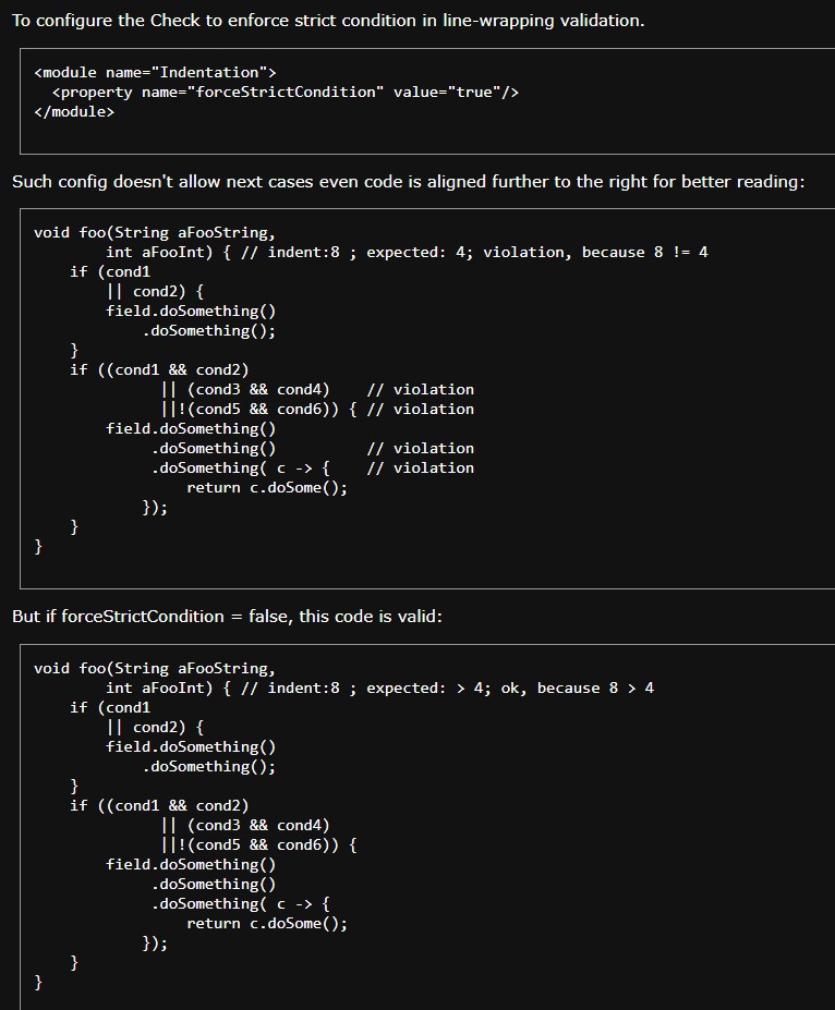 I think we need to set forceStrictCondition=false for Indentation check