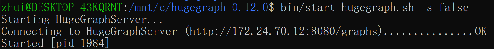 万分感谢[javeme]的回复,问题已解决。现将解决方案记录如下,以对后续学习者有所帮助。 解决方案: (1)、由于使用的是win10下的ubuntu子系统进行搭建,故可使用ifconfig命令,在子系统中查看一下其IP地址,如下图:  (2)、将rest-server.properties文件中的restserver.url=http://172.24.70.12:8080(上图中对应的IP地址) (3)、使用bin/start-hugegraph.sh -s false命令启动server,如下图(启动成功):  (4)、可在windows中的浏览器中查看启动结果,如下图:  (5)、也可在ubuntu子系统中运行links http://172.24.70.12:8080/graphs的命令,查看启动结果。 -- This is an automated message from the Apache Git Service. To respond to the message, please log on to GitHub and use the URL above to go to the specific comment. To unsubscribe, e-mail: [email protected] For queries about this service, please contact Infrastructure at: [email protected]