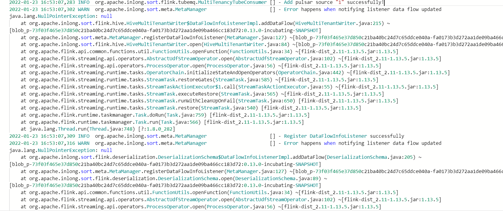 ### What happened sort-flink task catches an NPE.  ### What you expected to happen task run successfully ### How to reproduce create a InLong Group task and run a sort-flink task. ### Environment _No response_ ### InLong version master ### InLong Component Other for not specified component ### Are you willing to submit PR? - [ ] Yes, I am willing to submit a PR! ### Code of Conduct - [X] I agree to follow this project's [Code of Conduct](https://www.apache.org/foundation/policies/conduct) -- This is an automated message from the Apache Git Service. To respond to the message, please log on to GitHub and use the URL above to go to the specific comment. To unsubscribe, e-mail: [email protected] For queries about this service, please contact Infrastructure at: [email protected]