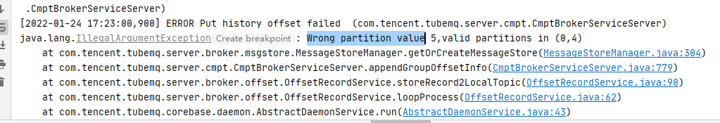 ### What happened When the system is running, storeRecord2LocalTopic reports a "Wrong partition value error" when saving the historical offset java.lang.IllegalArgumentException: Wrong partition value 5,valid partitions in (0,4)  ### What you expected to happen store history offset ### How to reproduce use test_groupNew1 group name to consume data ### Environment _No response_ ### InLong version master ### InLong Component InLong TubeMQ ### Are you willing to submit PR? - [ ] Yes, I am willing to submit a PR! ### Code of Conduct - [X] I agree to follow this project's [Code of Conduct](https://www.apache.org/foundation/policies/conduct) -- This is an automated message from the Apache Git Service. To respond to the message, please log on to GitHub and use the URL above to go to the specific comment. To unsubscribe, e-mail: [email protected] For queries about this service, please contact Infrastructure at: [email protected]