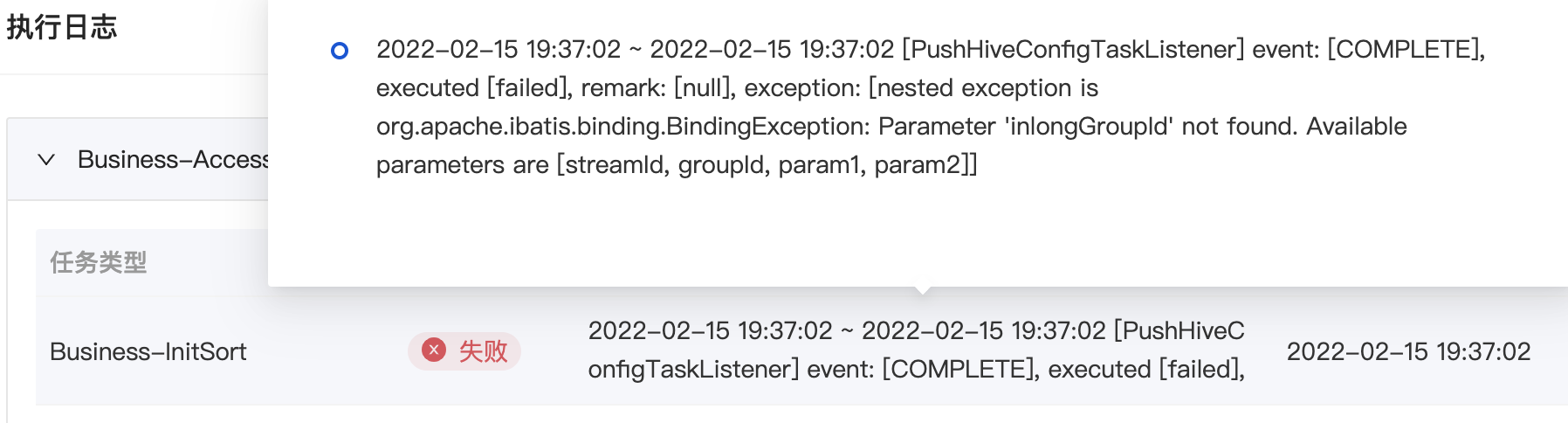 ### What happened  The error stack trance: ``` 2022-02-15 19:37:02.164 [async-process-event-notifier-0] ERROR o.a.i.manager.common.event.LogableEventListener:87 - listener exception:{"id":null,"processInstId":2,"processName":"CREATE_BUSINESS_RESOURCE","processDisplayName":"Business-Access-Resource","inlongGroupId":"b_docker_test_1","taskInstId":4,"elementName":"initSort","elementDisplayName":"Business-InitSort","eventType":"TaskEvent","event":"COMPLETE","listener":"PushHiveConfigTaskListener","startTime":1644925022148,"endTime":null,"state":-1,"async":false,"ip":"10.160.139.123","remark":null,"exception":"nested exception is org.apache.ibatis.binding.BindingException: Parameter 'inlongGroupId' not found. Available parameters are [streamId, groupId, param1, param2]","businessId":"b_test_1"} org.mybatis.spring.MyBatisSystemException: nested exception is org.apache.ibatis.binding.BindingException: Parameter 'inlongGroupId' not found. Available parameters are [streamId, groupId, param1, param2] at org.mybatis.spring.MyBatisExceptionTranslator.translateExceptionIfPossible(MyBatisExceptionTranslator.java:77) at org.mybatis.spring.SqlSessionTemplate$SqlSessionInterceptor.invoke(SqlSessionTemplate.java:446) at com.sun.proxy.$Proxy90.selectList(Unknown Source) at org.mybatis.spring.SqlSessionTemplate.selectList(SqlSessionTemplate.java:230) at org.apache.ibatis.binding.MapperMethod.executeForMany(MapperMethod.java:147) at org.apache.ibatis.binding.MapperMethod.execute(MapperMethod.java:80) at org.apache.ibatis.binding.MapperProxy$PlainMethodInvoker.invoke(MapperProxy.java:152) at org.apache.ibatis.binding.MapperProxy.invoke(MapperProxy.java:85) at com.sun.proxy.$Proxy134.selectFields(Unknown Source) at sun.reflect.NativeMethodAccessorImpl.invoke0(Native Method) at sun.reflect.NativeMethodAccessorImpl.invoke(NativeMethodAccessorImpl.java:62) at sun.reflect.DelegatingMethodAccessorImpl.invoke(DelegatingMethodAccessorImpl.java:43) at java.lang.reflect.Method.invoke(Method.java:498) at org.springframework.aop.support.AopUtils.invokeJoinpointUsingReflection(AopUtils.java:344) at org.springframework.aop.framework.ReflectiveMethodInvocation.invokeJoinpoint(ReflectiveMethodInvocation.java:198) at org.springframework.aop.framework.ReflectiveMethodInvocation.proceed(ReflectiveMethodInvocation.java:163) at org.springframework.dao.support.PersistenceExceptionTranslationInterceptor.invoke(PersistenceExceptionTranslationInterceptor.java:137) at org.springframework.aop.framework.ReflectiveMethodInvocation.proceed(ReflectiveMethodInvocation.java:186) at org.springframework.aop.framework.JdkDynamicAopProxy.invoke(JdkDynamicAopProxy.java:215) at com.sun.proxy.$Proxy135.selectFields(Unknown Source) at org.apache.inlong.manager.service.thirdpart.sort.PushHiveConfigTaskListener.getDataFlowInfo(PushHiveConfigTaskListener.java:153) at org.apache.inlong.manager.service.thirdpart.sort.PushHiveConfigTaskListener.listen(PushHiveConfigTaskListener.java:127) at org.apache.inlong.manager.common.event.LogableEventListener.executeListenerWithLog(LogableEventListener.java:80) at org.apache.inlong.manager.common.event.LogableEventListener.listen(LogableEventListener.java:58) at org.apache.inlong.manager.common.event.task.TaskEventNotifier.lambda$syncLogableNotify$34(TaskEventNotifier.java:102) at java.util.ArrayList.forEach(ArrayList.java:1257) at org.apache.inlong.manager.common.event.task.TaskEventNotifier.notify(TaskEventNotifier.java:62) at org.apache.inlong.manager.workflow.core.processor.ServiceTaskProcessor.complete(ServiceTaskProcessor.java:100) ``` ### What you expected to happen No error occurred. ### How to reproduce 1) Create a DataGroup and DataStream; 2) Create Hive storage; 3) Approve the workflow. You'll see the error info in the [Execute Log] tab. ### Environment _No response_ ### InLong version master ### InLong Component InLong Manager ### Are you willing to submit PR? - [X] Yes, I am willing to submit a PR! ### Code of Conduct - [X] I agree to follow this project's [Code of Conduct](https://www.apache.org/foundation/policies/conduct) -- This is an automated message from the Apache Git Service. To respond to the message, please log on to GitHub and use the URL above to go to the specific comment. To unsubscribe, e-mail: [email protected] For queries about this service, please contact Infrastructure at: [email protected]