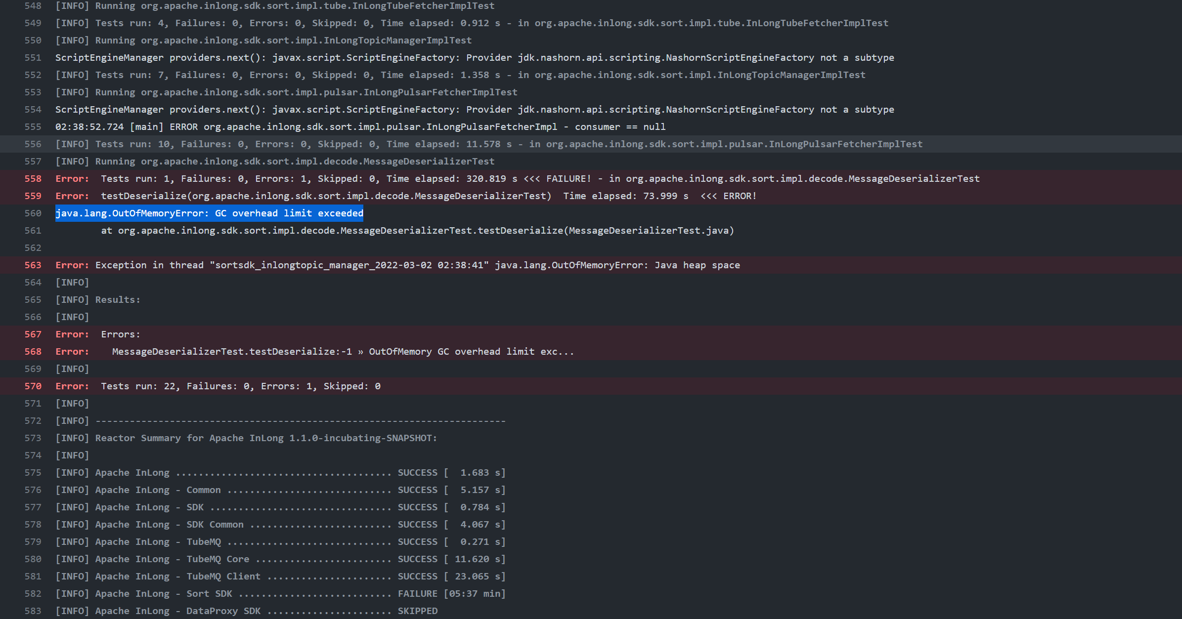 ### What happened "sortsdk_inlongtopic_manager_2022-03-02 02:38:41" java.lang.OutOfMemoryError: Java heap space  ### What you expected to happen The parallel execution of unit test results in the thread not closing normally ### How to reproduce https://github.com/apache/incubator-inlong/runs/5385397940?check_suite_focus=true ### Environment _No response_ ### InLong version master ### InLong Component InLong SDK ### Are you willing to submit PR? - [X] Yes, I am willing to submit a PR! ### Code of Conduct - [X] I agree to follow this project's [Code of Conduct](https://www.apache.org/foundation/policies/conduct) -- This is an automated message from the Apache Git Service. To respond to the message, please log on to GitHub and use the URL above to go to the specific comment. To unsubscribe, e-mail: [email protected] For queries about this service, please contact Infrastructure at: [email protected]