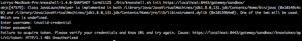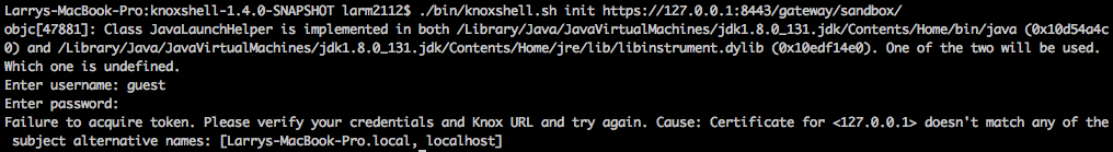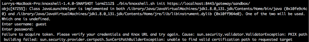 lmccay4 opened a new pull request #232: KNOX-2101 - knoxshell doesn't handle invalid TLS well URL: https://github.com/apache/knox/pull/232 ## What changes were proposed in this pull request? Modified exception message to include the specific reason for failure with "Cause:" as seen in the following examples Untrusted certificate:  Hostname verification failure:  Invalid login credentials:  ## How was this patch tested? Manual tests